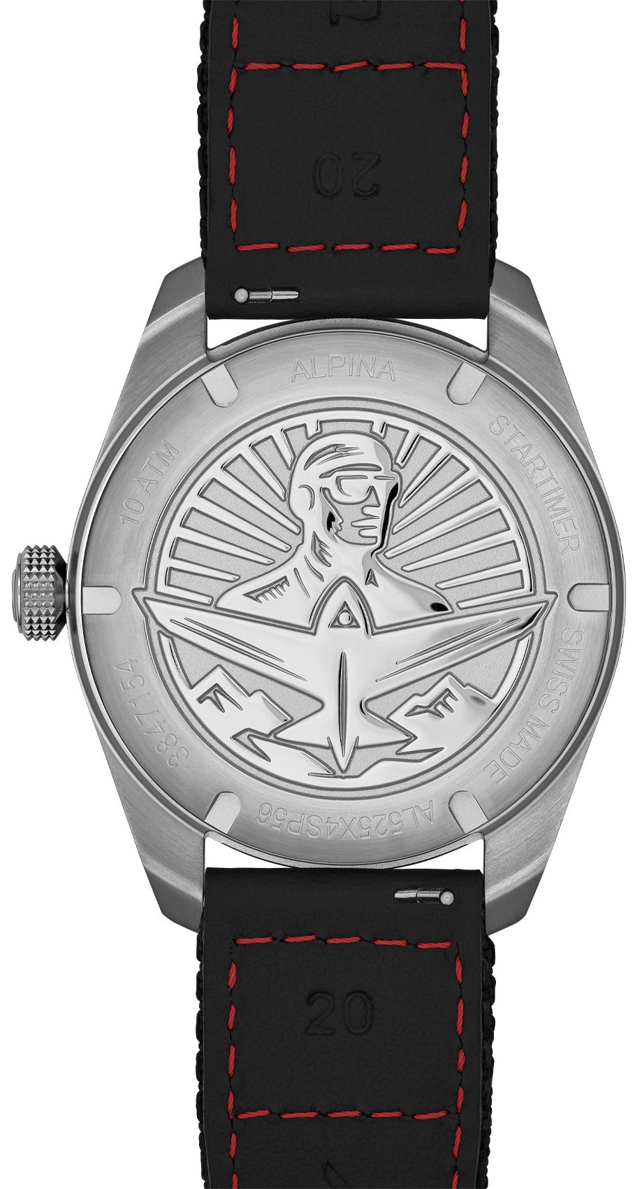 Alpina Startimer Pilot Automatic AL-525BW4S36 jsou pánské pilotní automatické hodinky na černém řemínku z kůže a textilu s červeným prošíváním a trnovou sponou. Pouzdro z nerezové oceli má průměr 40 milimetrů a zadní dýnko zdobené hydraulicky lisovaným motivem letectví. Matný černý číselník s ukazatelem data na šesté hodině je chráněn odolným safírovým sklem s antireflexní vrstvou. Protiváhou centrální sekundové ručky je červený trojúhelník - logo Alpiny symbolizující alpské vrcholy. Ručičky a indexy disponují luminiscenčním nátěrem Super-LumiNova®, který garantuje perfektní čitelnost za zhoršených světelných podmínek. Pohon hodinek zajišťuje spolehlivý mechanický strojek AL-525 (základem je strojek La Joux-Perret) s automatickým nátahem a rezervou chodu 68 hodin. S vodotěsností 20 ATM jsou hodinky vhodné pro hlubinné potápění.