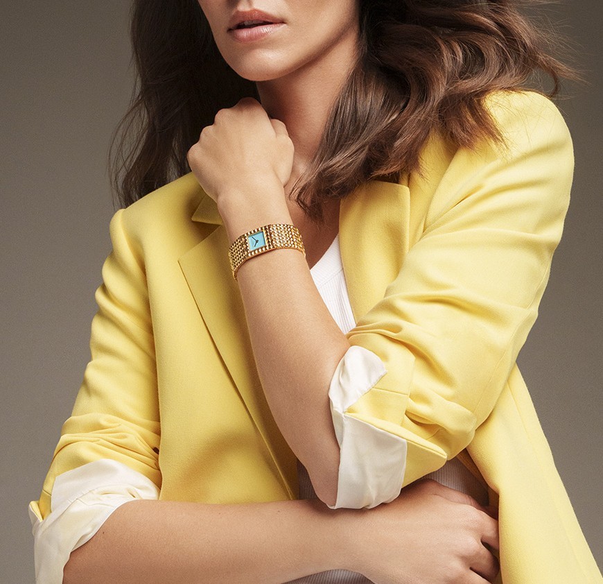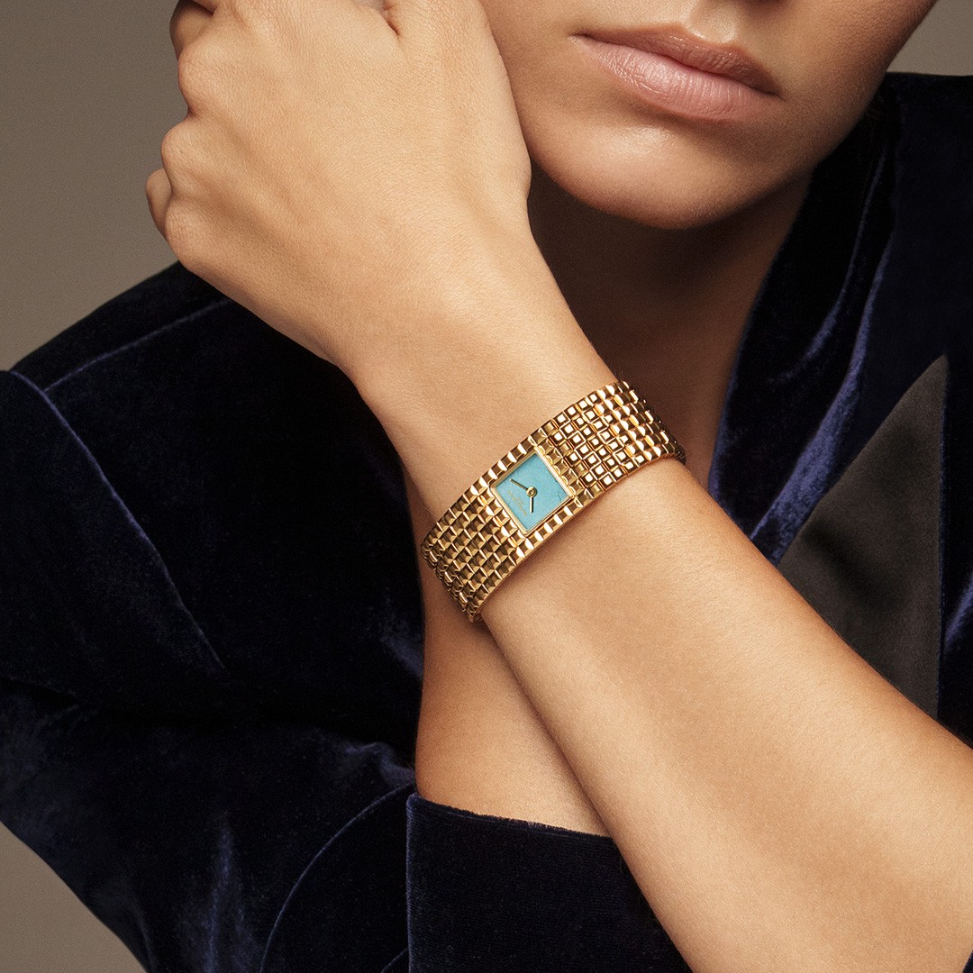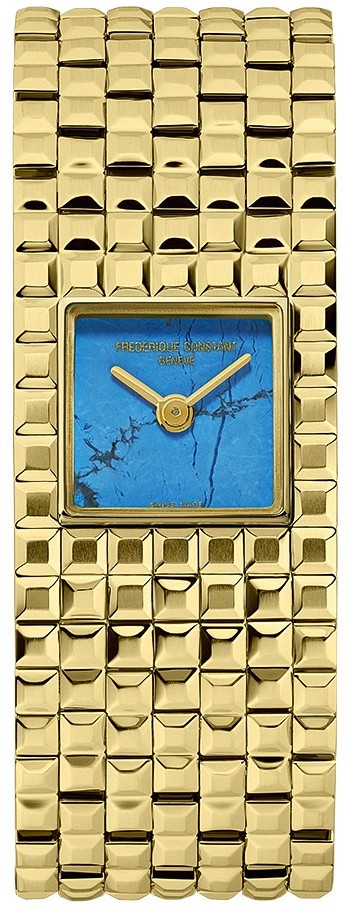 Frederique Constant Classics Manchette FC-200TU1MC5B jsou dámské bateriové hodinky na ocelovém náramku s motivem ‘Clou de Paris’ a integrovanou sponou. Hranaté pouzdro z nerezové oceli má rozměry 20 x 25,7 milimetru. Náramek a pouzdro disponují povrchovou PVD úpravou zlaté barvy. Modrý číselník s tyrkysem je chráněn odolným safírovým sklem s antireflexní vrstvou. Pohon hodinek zajišťuje spolehlivý quartzový strojek FC-200, jehož základem je Ronda 1032. S vodotěsností 3 ATM jsou hodinky odolné proti vlhkosti a dešti.