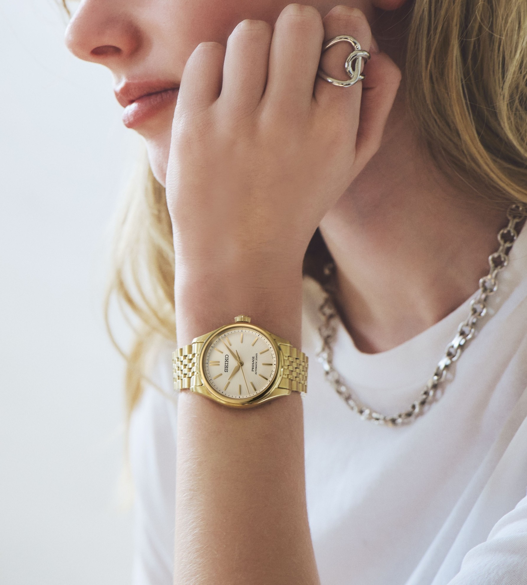 Dámské automatické hodinky Seiko Presage Classic SPB524J1 na sedmiřadém ocelovém náramku s povrchovou PVD úpravou zlaté barvy a motýlkovou sponou. Pouzdro z nerezové oceli ve stejné barvě má průměr 36 milimetrů a průhledné zadní dýnko. Bílý texturovaný číselník s efektem slunečního brusu je chráněn odolným safírovým sklem s antireflexní vrstvou. Pohon hodinek zajišťuje mechanický strojek 6R51 s automatickým nátahem a rezervou chodu přibližně 72 hodin. Tento manufakturní strojek s funkcí hackingu lze v případě potřeby natahovat i ručně pomocí signované korunky. Vodotěsnost hodinek činí 10 ATM a jsou tedy vhodné pro koupání nebo šnorchlování.