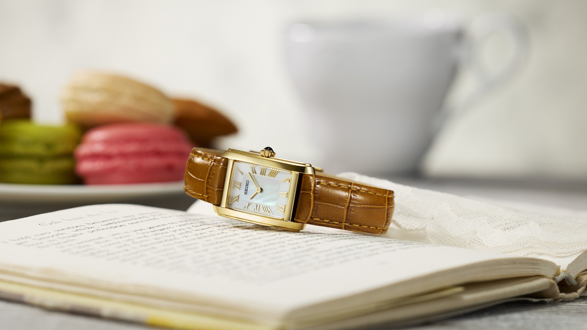 Dámské bateriové elegantní hodinky Seiko Quartz SWR100P1 na světle hnědém koženém řemínku s trnovou sponou. Pouzdro z nerezové oceli opatřené PVD úpravou zlaté barvy je široké 22,2 milimetru a má korunku osazenou kabošonem. Perleťový číselník je chráněn odolným sklem Hardlex a jeho krása vyniká zejména na přímém světle, kdy můžeme pozorovat hru barev perleti. Pohon hodinek zajišťuje spolehlivý quartzový strojek 4N30. Vodotěsnost hodinek činí 5 ATM a jsou tedy odolné proti dešti a při sprchování.