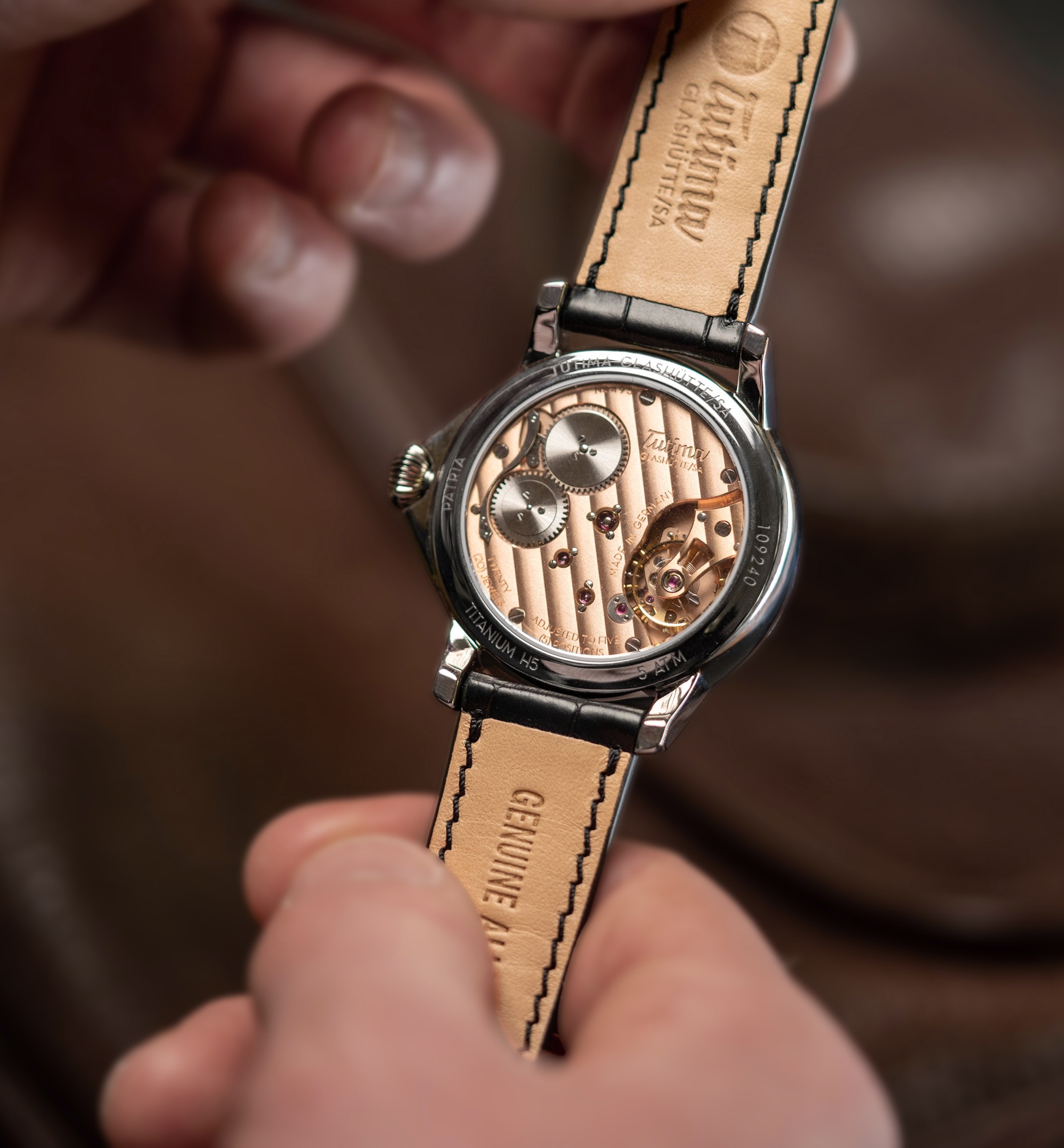 Tutima Patria 6612-21 jsou pánské elegantní mechanické hodinky na černém řemínku z aligátoří kůže s titanovou trnovou sponou. Pouzdro z titanu třídy 5 má průměr 41 milimetrů a průhledné dýnko. Černý číselník je chráněn odolným safírovým sklem s antireflexní vrstvou. Pohon hodinek zajišťuje manufakturní mechanický strojek Tutima 617 s ručním nátahem a rezervou chodu 65 hodin. S vodotěsností 5 ATM jsou hodinky odolné proti dešti a při sprchování.
