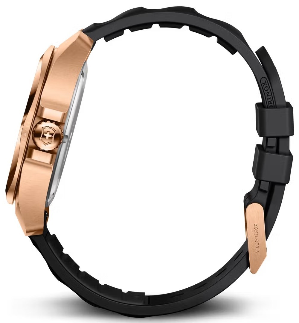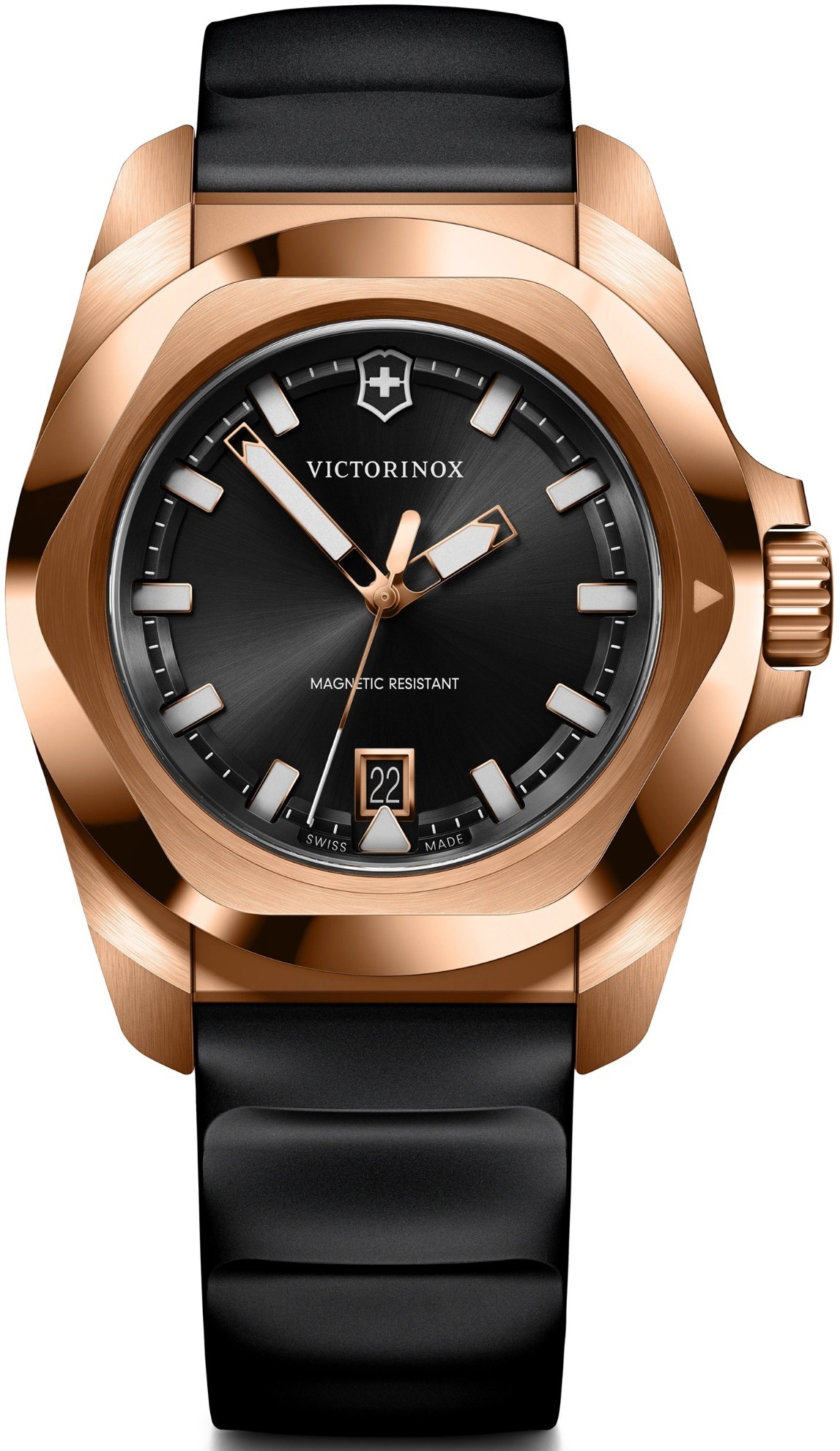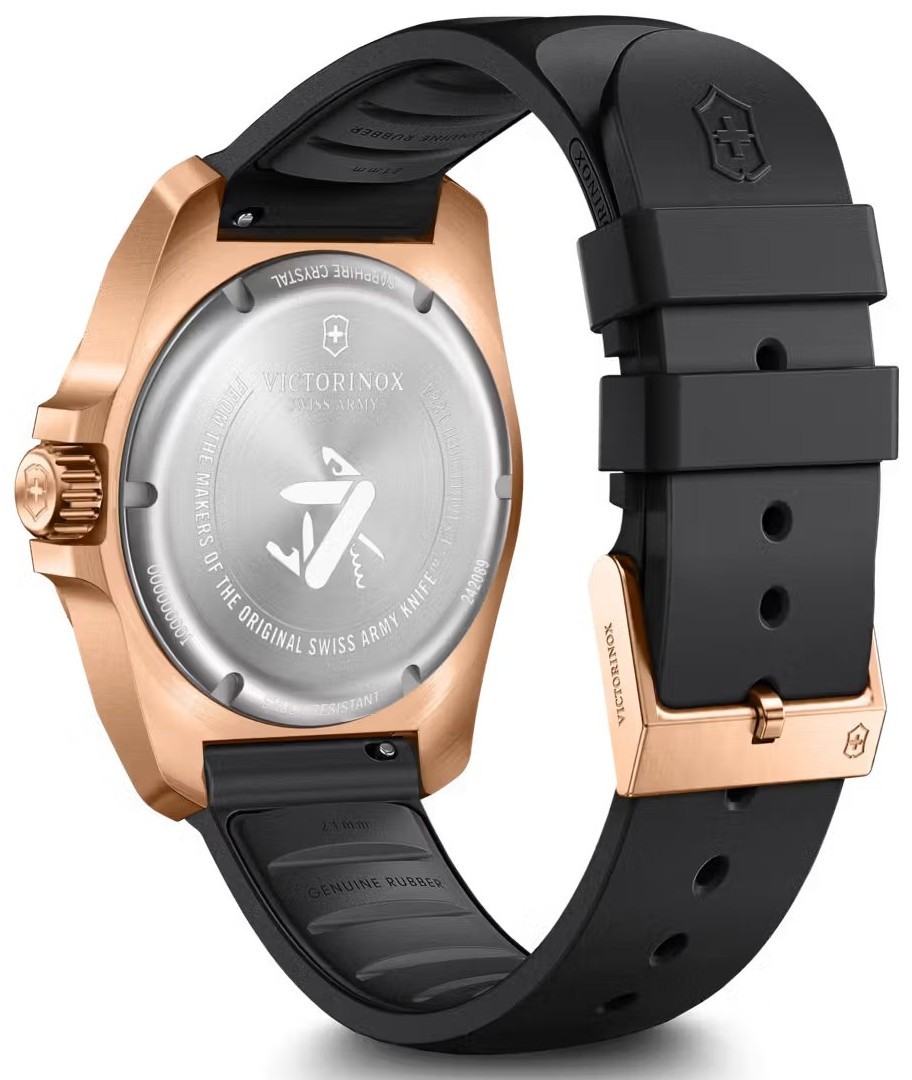 Victorinox I.N.O.X. 242089 jsou pánské sportovní bateriové hodinky na černém kaučukovém řemínku s trnovou sponou. Pouzdro z nerezové oceli s povrchovou PVD úpravou v barvě růžového zlata má průměr 41 milimetrů a šroubovací korunku. Černý číselník s efektem slunečního brusu a ukazatelem data na šesté hodině je chráněn odolným safírovým sklem s antireflexní vrstvou. Ručičky a indexy pokrývá luminiscenční nátěr Super-LumiNova®, který po nasvícení garantuje perfektní čitelnost za zhoršených světelných podmínek. Pohon hodinek zajišťuje švýcarský quartzový strojek Ronda 715. S vodotěsností 20 ATM jsou hodinky vhodné pro hlubinné potápění.