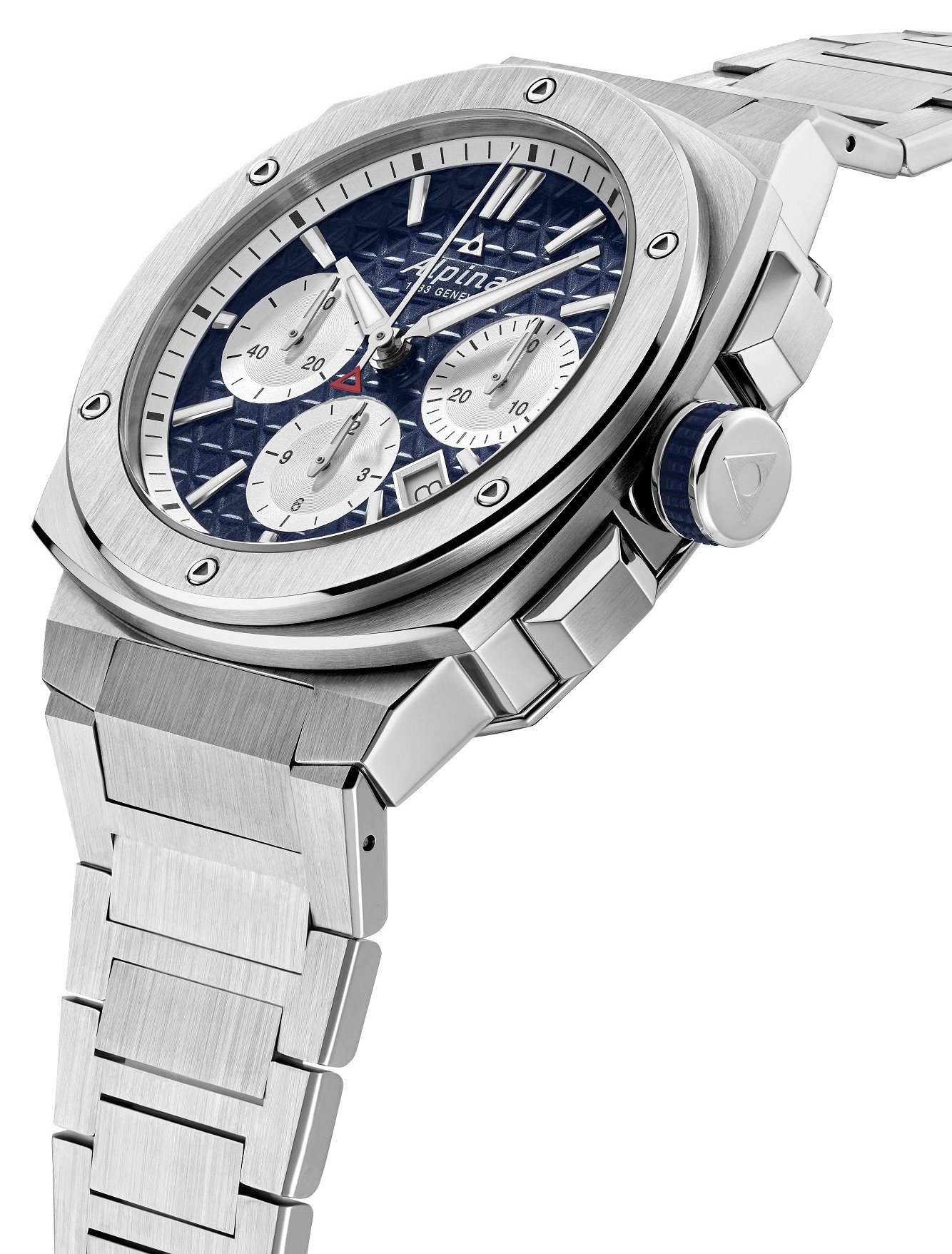 Im Jahr 2023 kehrte der Chronograph in die Alpiner Extreme Kollektion zurück. Diesmal in einem kompakteren und eckigeren Gehäuse mit einem Durchmesser von 41 mm und einem dunkelblauen Zifferblatt. Der Chronograph ist mit drei Zählern und einem Datumsfenster auf der Position halb fünf ausgestattet. Zur weiteren Stärkung der robusten Identität sind die Uhren mit einem fein gebürsteten integrierten Stahlband ausgestattet, das mit dem Gehäuse und der Lünette harmoniert. Im Inneren schlägt das Kaliber AL-730, das sich mit einer verlängerten Gangreserve von 62 Stunden rühmen kann. Das ist mehr als genug für ein verlängertes Wochenende voller Abenteuer. Der Alpiner Extreme Chronograph Automatic ist dank der verschraubten Krone mit Kronengriff bis 100 Meter wasserdicht und ist ausschließlich mit einem Stahlband mit einer Faltschließe erhältlich, die durch zwei seitliche Knöpfe gesichert ist.