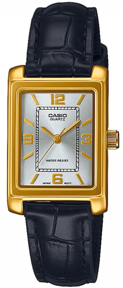 Casio Collection LTP-1234PGL-7A2EF sind elegante Damen-Quarzuhren mit schwarzem Lederarmband und Dornschließe. Das rechteckige Gehäuse mit den Maßen 21 x 32 Millimeter ist aus Messing gefertigt. Das silberne Zifferblatt mit Sonnenschliff-Effekt und goldfarbenen Details wird durch Mineralglas geschützt. Die Uhren sind beständig gegen zufälligen Wasserkontakt, zum Beispiel beim Händewaschen und im Regen.