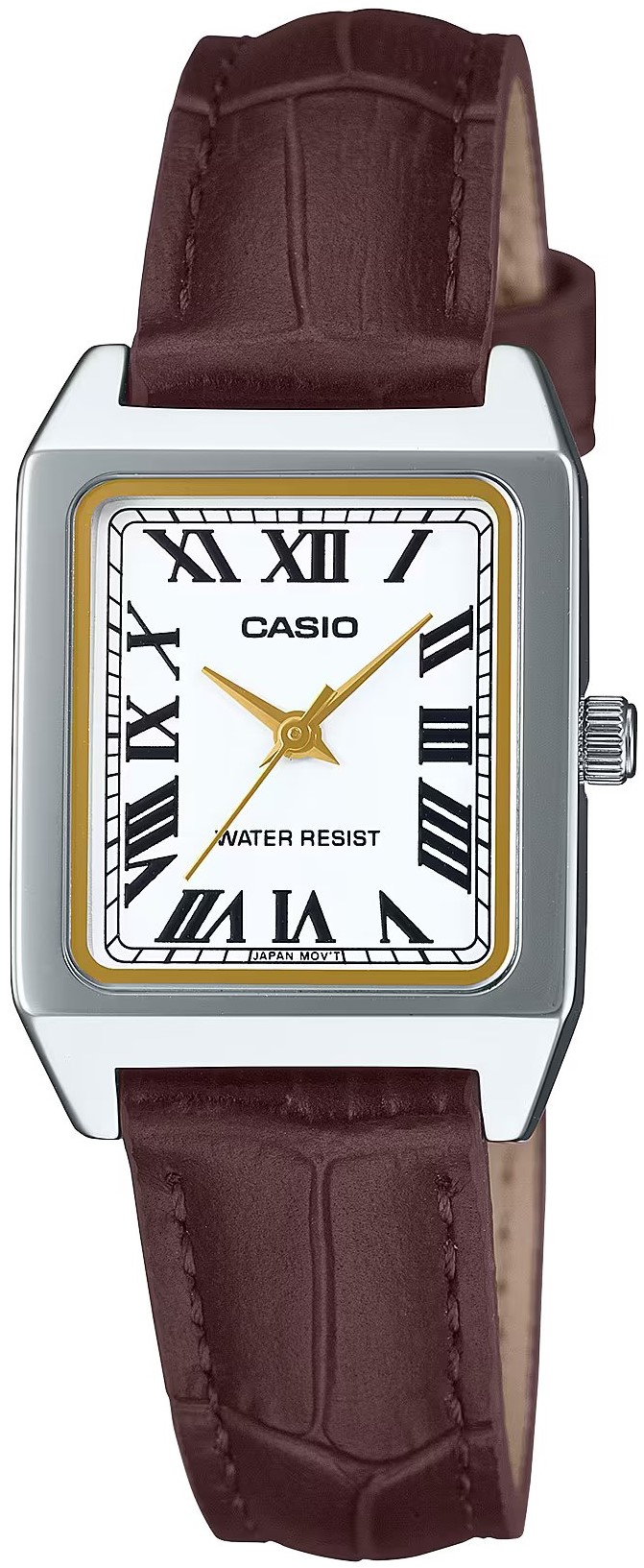 Casio Collection LTP-B150L-7B2EF sind elegante Quarz-Damenuhren mit einem rechteckigen Stahlgehäuse von 22 x 31 Millimetern, das nahtlos in ein braunes Lederarmband mit Dornschließe übergeht. Das weiße Zifferblatt mit schwarzen römischen Ziffern und goldfarbenen Details ist durch ein Mineralglas geschützt. Die Uhren sind bei zufälligem Kontakt mit Wasser, z. B. beim Händewaschen und im Regen, widerstandsfähig.