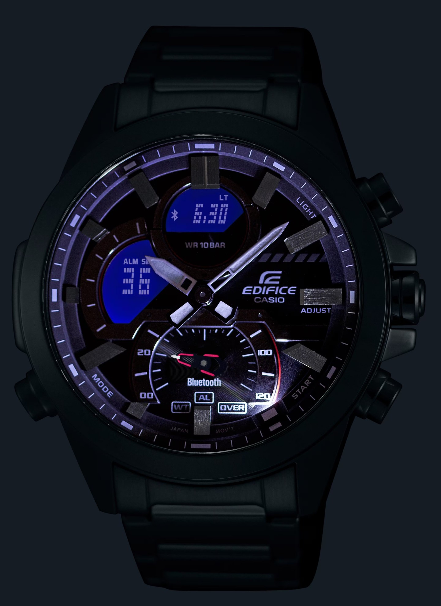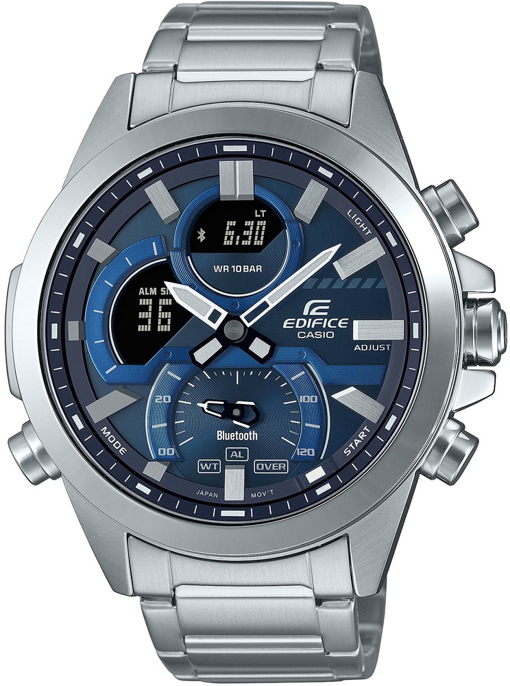Casio Edifice ECB-30D-2AEF sind Herren-Quarzuhren, deren Gehäuse mit einem Durchmesser von 48,7 Millimetern zusammen mit dem Armband aus Edelstahl gefertigt ist. Das blaue kombinierte Zifferblatt wird durch ein Mineralglas geschützt. Die Zeiger und Indizes sind mit einer lumineszierenden Schicht überzogen, die zusammen mit der doppelten LED-Hintergrundbeleuchtung des Displays eine bessere Lesbarkeit bei schlechten Lichtverhältnissen gewährleistet. Die Uhr wird von einem batteriebetriebenen Uhrwerk angetrieben und verfügt über eine Stoppuhrfunktion mit einer Genauigkeit von 1/1000 Sekunden, Timer, Kalender einschließlich Datumsanzeige, Wochentag und Monat, Wecker und Weltzeit. Sie können mit einem Smartphone über Bluetooth synchronisiert werden und dank der Phone Finder-Funktion ertönt Ihr Telefon, wenn Sie die Uhrentaste drücken, was die Suche erleichtert. Die Wasserdichtigkeit der Uhr beträgt 10 ATM und ist somit zum Schwimmen und Schnorcheln geeignet.