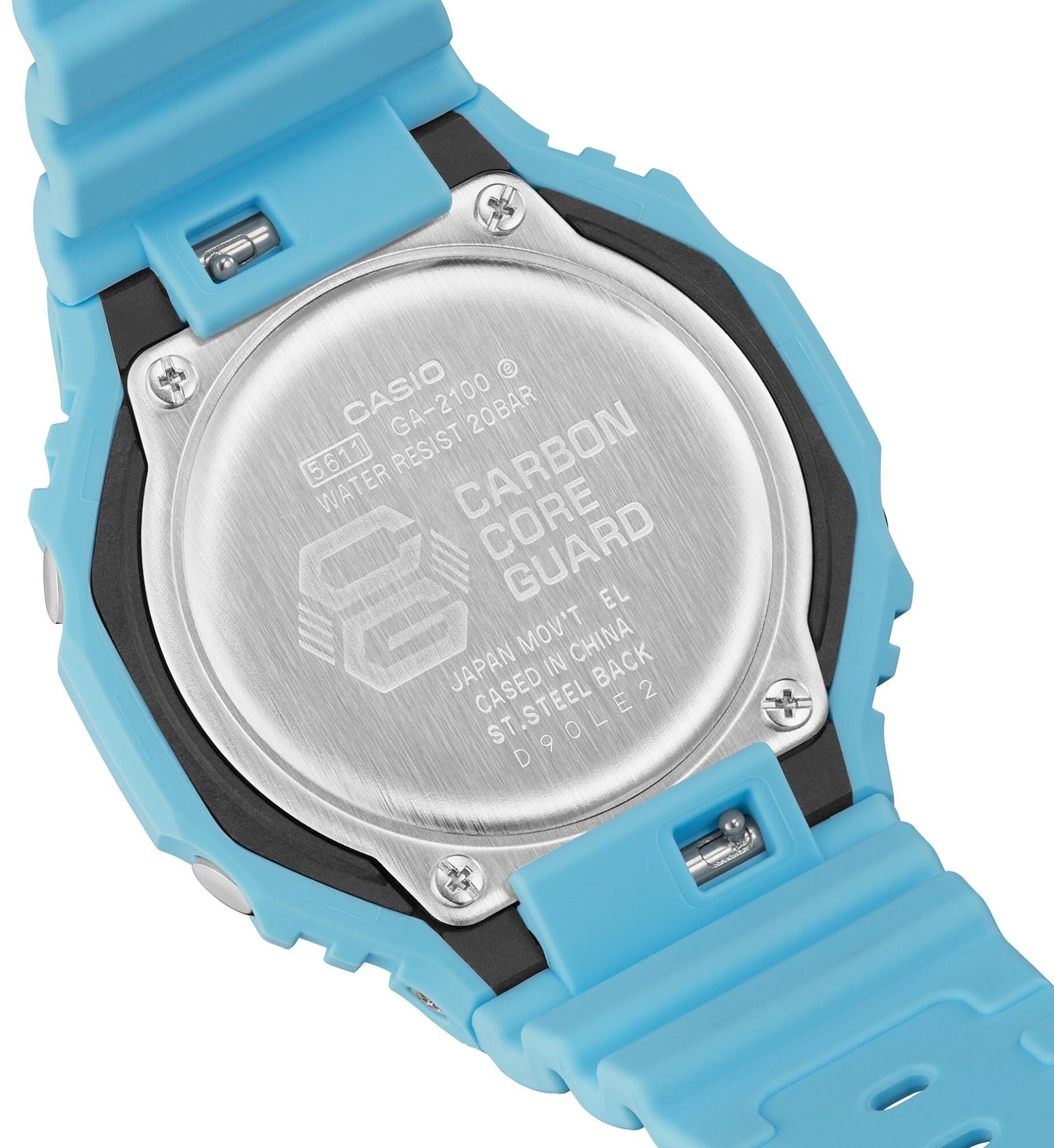 Die G-Shock GA-2100 Serie stellt die dünnsten Uhren der aktuellen G-Shock-Modelle dar, ihr Gehäuse mit einem Durchmesser von 45,4 Millimetern aus Harz hat nämlich eine Höhe von nur 11,8 Millimetern. Das Gehäuse verfügt über ein neues Konzept der Lünette des ursprünglichen G-Shock-Modells DW-5000C aus dem Jahr 1983, auf das diese Serie aufbaut. Neben dem neuen Design unterscheidet sich diese Serie vom Modell DW-5000C durch die neue Konstruktion Carbon Core Guard, also die Verstärkung des Gehäuses mit Kohlefasern, die eine hohe Widerstandsfähigkeit des Gehäuses und gleichzeitig ein geringes Gewicht der Uhr – nur 51 Gramm – gewährleistet. Das traditionell geformte Armband mit Dornschließe ist aus Harz mit matter Oberfläche gefertigt. Für den Antrieb der Uhr sorgt eine Batterie mit einer Lebensdauer von bis zu 3 Jahren und es ist möglich, mit ihnen auch zu tauchen, da ihre Wasserdichtigkeit 200 Meter erreicht.