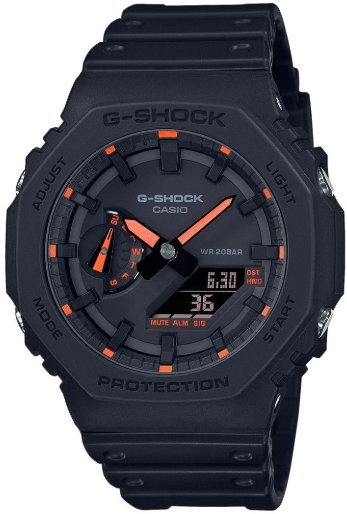 Die G-Shock GA-2100 Serie stellt die dünnsten Uhren der aktuellen G-Shock-Modelle dar, ihr Gehäuse mit einem Durchmesser von 45,4 Millimetern aus Harz hat nämlich eine Höhe von nur 11,8 Millimetern. Das Gehäuse verfügt über ein neues Design der Lünette des ursprünglichen G-Shock DW-5000C Modells aus dem Jahr 1983, auf das diese Serie aufbaut. Neben dem neuen Design unterscheidet sich diese Serie vom Modell DW-5000C durch die neue Konstruktion des Carbon Core Guard, also die Verstärkung des Gehäuses mit Kohlefasern, die eine hohe Widerstandsfähigkeit des Gehäuses und gleichzeitig ein geringes Gewicht der Uhr – nur 51 Gramm – gewährleistet. Das traditionell geformte Armband mit Dornschließe ist aus Harz mit matter Oberfläche gefertigt. Für den Betrieb der Uhr sorgt eine Batterie mit einer Lebensdauer von bis zu 3 Jahren und sie ist auch zum Tauchen geeignet, da ihre Wasserdichtigkeit 200 Meter erreicht.
