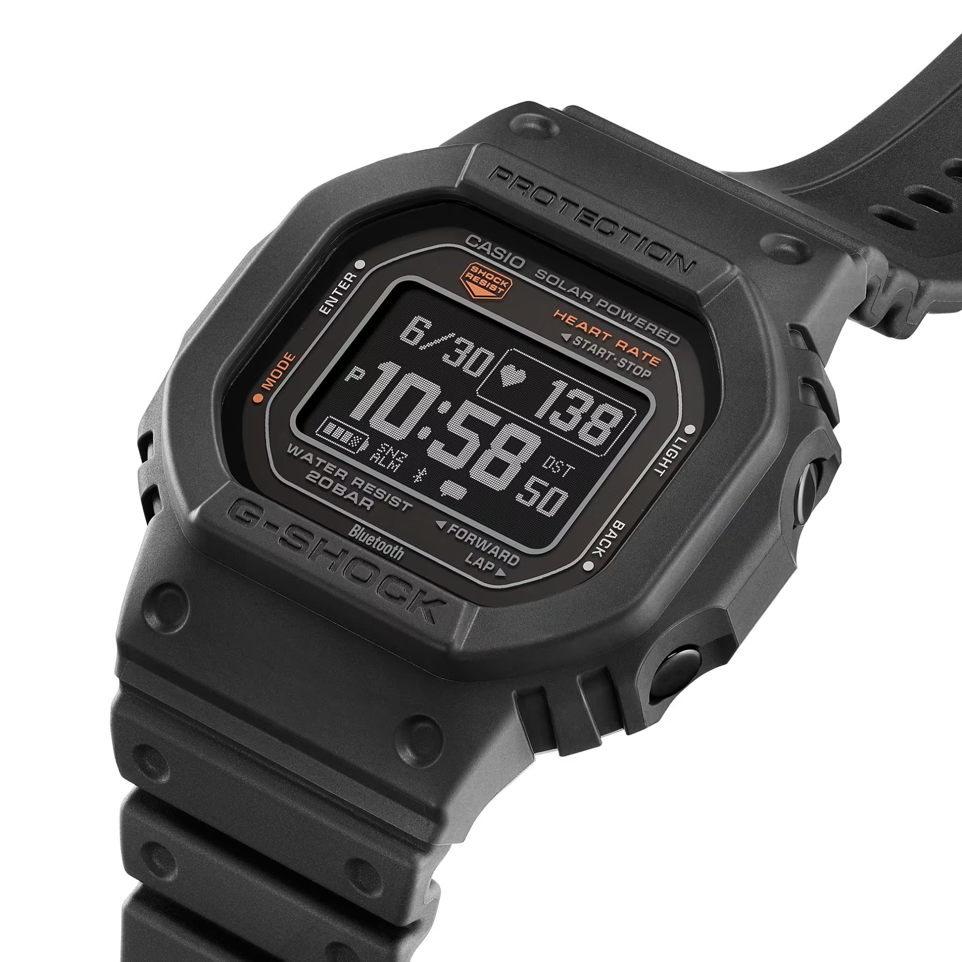 Sportuhren G-Shock G-Squad DW-H5600 ermöglichen es Ihnen, Ihre sportlichen Ergebnisse zu verfolgen und gleichzeitig Ihre Gesundheit im Auge zu behalten. Sie sind mit einem optischen Sensor zur Messung der Herzfrequenz auf der Rückseite des Gehäuses ausgestattet. Der Sensor verwendet LED-Licht, um Änderungen des Blutflusses zur Überwachung der Herzfrequenz zu messen. Die Uhr verfügt auch über einen Beschleunigungsmesser zur Schrittzählung. Für noch genauere Messungen der Entfernung genügt es, die Uhr mit einem Smartphone zu koppeln, dessen GPS die vom Beschleunigungsmesser der Uhr erfassten Daten anpasst.