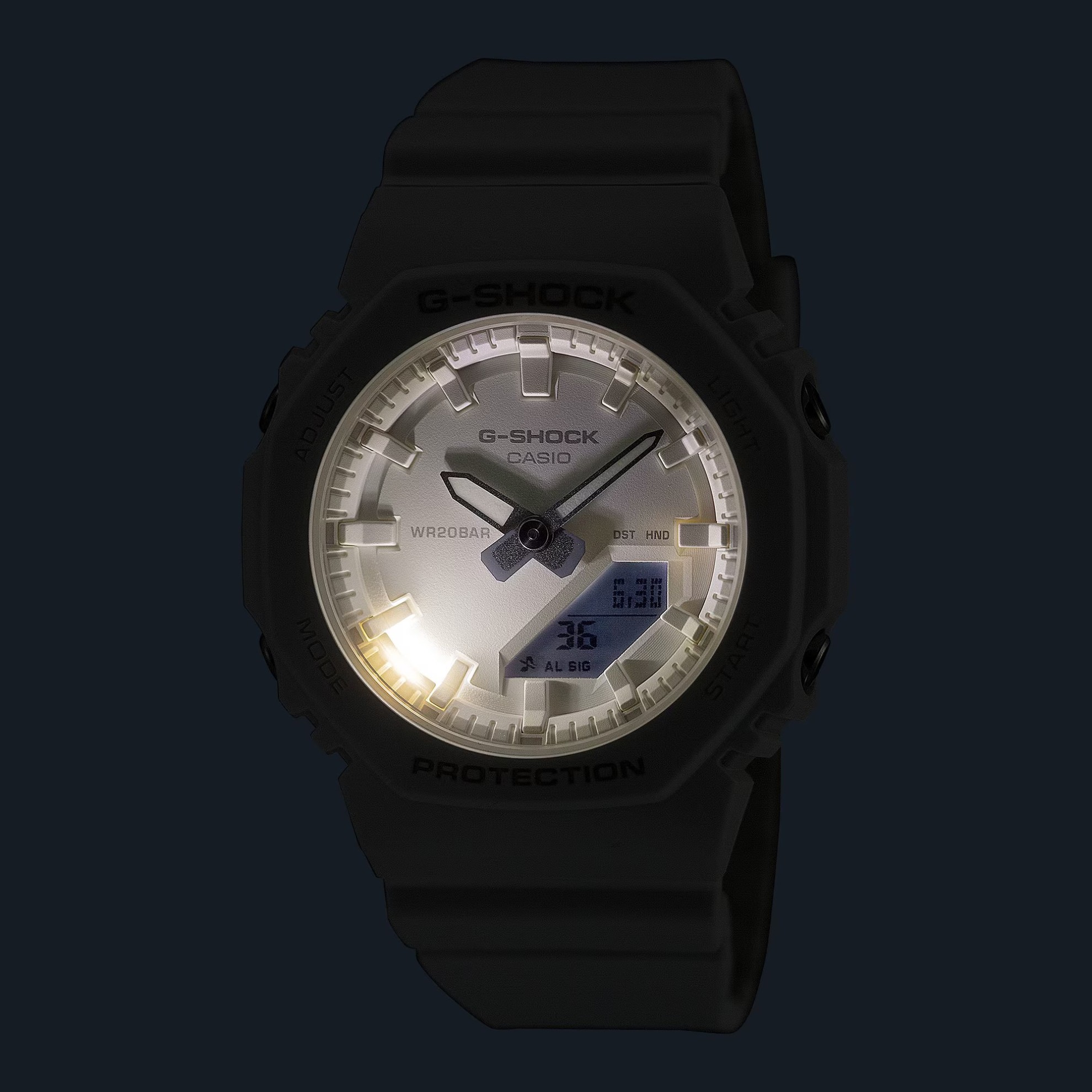 Die Casio G-Shock GMA-P2100-7AER ist eine sportliche Damen-Quarzuhr mit einem weißen Harzarmband und einer Dornschließe. Das Gehäuse aus Epoxidharz hat einen Durchmesser von 40,2 Millimetern und eine achteckige Lünette. Das weiße Zifferblatt mit digitalem Display und LED-Beleuchtung ist mit einem widerstandsfähigen Mineralglas abgedeckt. Der Antrieb der Uhr erfolgt durch ein Quarzwerk 5730 mit einer Genauigkeit von ±15 Sekunden pro Monat. Die Uhr verfügt über zahlreiche Funktionen, darunter einen Kalender mit Datums-, Wochentags- und Monatsanzeige, einen Wecker, eine Stoppuhr, einen Timer, Weltzeit und die Anzeige der Zeit im 24-Stunden-Format. Die Uhr ist stoßfest und mit einer Wasserdichtigkeit von 20 ATM für das Tauchen in großen Tiefen geeignet.