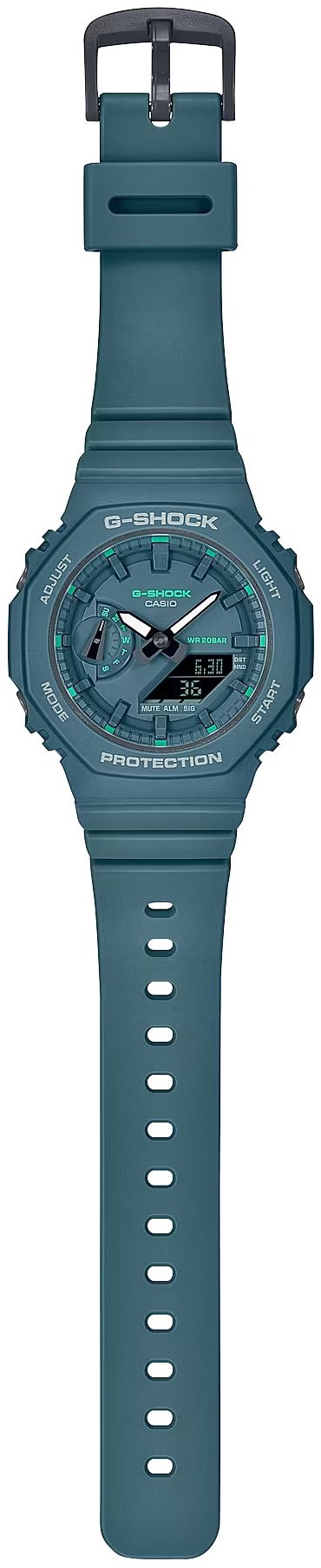 Casio G-Shock Mini Carbon Core Guard GMA-S2100GA-3AER sind Damen-Sportbatterieuhren mit einem blauen Harzarmband und einer Dornschließe. Das Gehäuse aus Epoxidharz und Carbon hat einen Durchmesser von 42,9 Millimetern, eine achteckige Lünette und einen Stahlboden. Das blaue Zifferblatt mit digitalem Display und LED-Hintergrundbeleuchtung ist durch ein widerstandsfähiges Mineralglas geschützt. Das Uhrwerk wird durch ein Quarzwerk 5611 mit einer Genauigkeit von ±15 Sekunden pro Monat angetrieben. Die Uhr verfügt über viele Funktionen, darunter einen Kalender mit Datums-, Wochentags- und Monatsanzeige, einen Wecker, eine Stoppuhr, einen Timer, eine Weltzeitanzeige und eine 24-Stunden-Zeitanzeige. Die Uhr ist stoßfest und mit einer Wasserdichtigkeit von 20 ATM für das Tiefseetauchen geeignet.