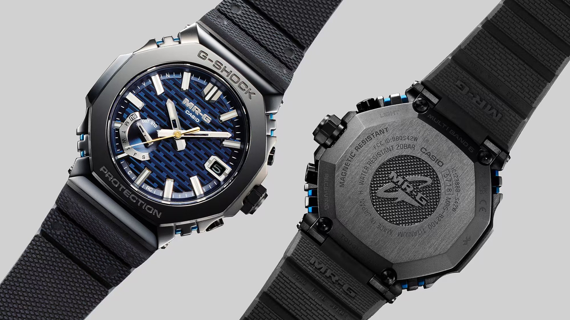 Casio G-Shock MRG-B2100R-2ADR sind Herren-Sportuhren mit Funksteuerung auf einem schwarzen Armband aus Epoxidharz mit Faltschließe. Das Gehäuse aus einer Titanlegierung auf Ti64-Basis hat einen Durchmesser von 44,4 Millimetern und eine verschraubte Krone. Der obere Teil der achteckigen Lünette besteht aus Cobarion, einer Legierung, die viermal härter ist als Titan. Das blau-schwarze Zifferblatt mit Datumsanzeige, Wochentagsanzeige und LED-Beleuchtung wird durch ein robustes Saphirglas mit entspiegelter Beschichtung geschützt. Das Zifferblattmuster ist inspiriert von Kigumi, einer traditionellen japanischen Kunst von ineinandergreifenden Holzelementen. Der Antrieb der Uhr erfolgt durch das Kaliber 5718 mit Solarantrieb und einer Genauigkeit von ±15 Sekunden pro Monat. Die Uhr kann über Bluetooth mit einem Telefon gekoppelt werden, was zusätzliche Funktionen wie Zeitsynchronisation, Telefonsuche usw. bietet. Die Uhr ist stoßfest und mit einer Wasserdichtigkeit von 20 ATM für das Tiefseetauchen geeignet.