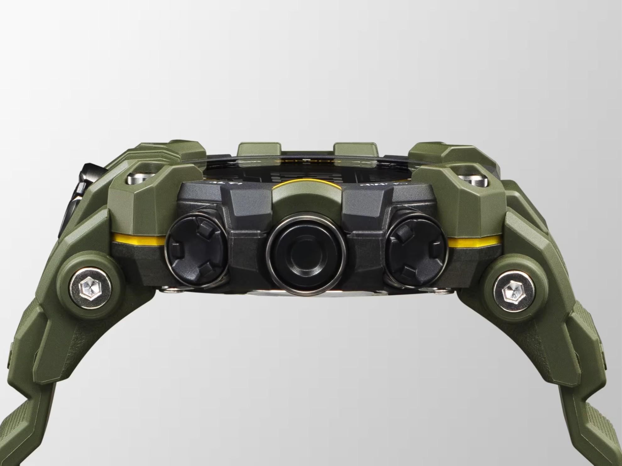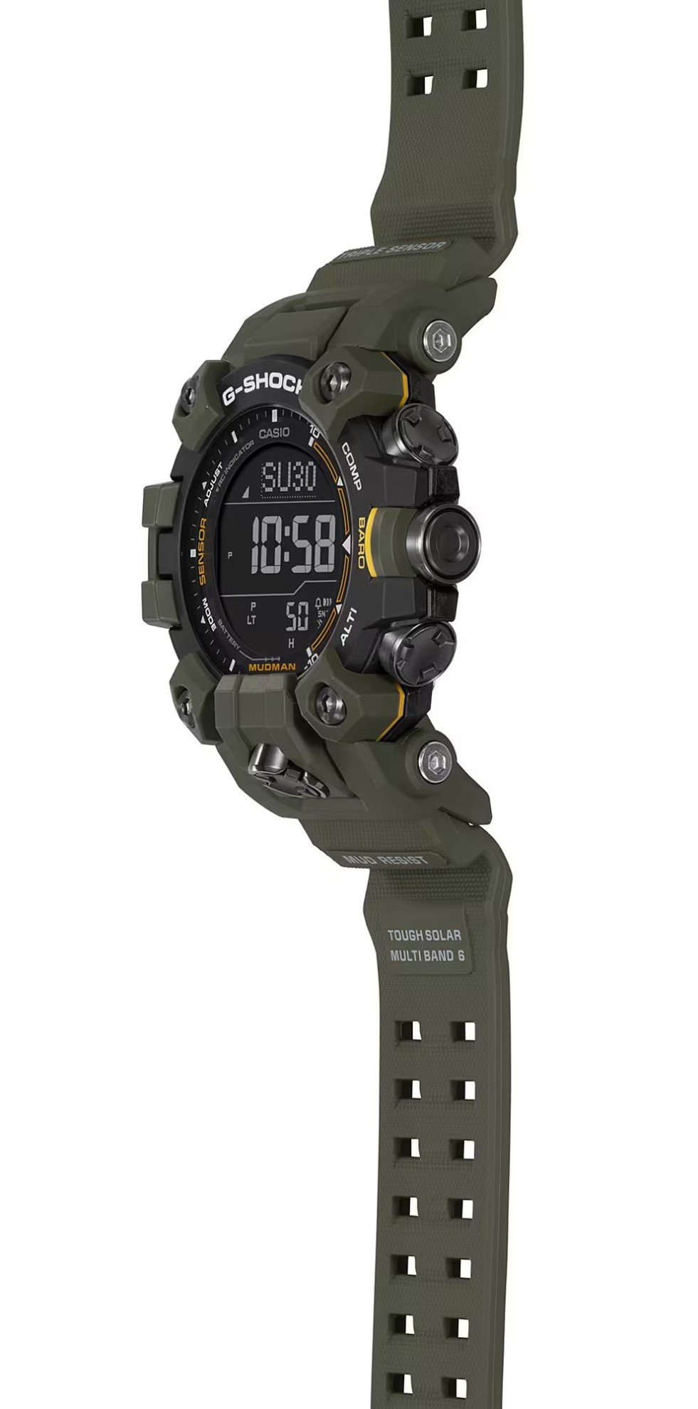 Casio G-Shock Mudman GW-9500-3ER sind sportliche Herren-Funkuhren mit einem grünen Harzarmband und einer Dornschließe. Das Gehäuse aus Epoxidharz und Karbon in Kombination mit Stahlelementen hat einen Durchmesser von 52,7 Millimetern. Das Zifferblatt mit digitalem Display und LED-Hintergrundbeleuchtung wird durch ein robustes Mineralglas geschützt. Der Antrieb der Uhr wird durch ein Werk 3553 mit Solarantrieb mit einer Genauigkeit von ±15 Sekunden pro Monat gewährleistet. Die Uhr verfügt über viele Funktionen, einschließlich eines Kalenders mit Datums-, Wochentags- und Monatsanzeige, Wecker, Stoppuhr, Timer, Weltzeit, Ladezustandsanzeige und 24-Stunden-Zeitformat. Dank der Sensoren bietet sie ihren Benutzern auch Funktionen wie Kompass, Barometer, Höhenmesser, Thermometer und Tag-Nacht-Anzeige (Sonnenaufgang und -untergang). Die Uhr ist stoß- und schlammbeständig und mit einer Wasserdichtigkeit von 20 ATM für das Tiefseetauchen geeignet.