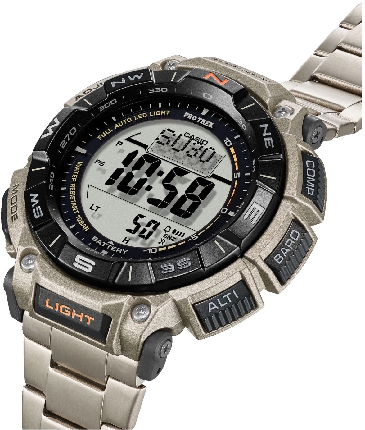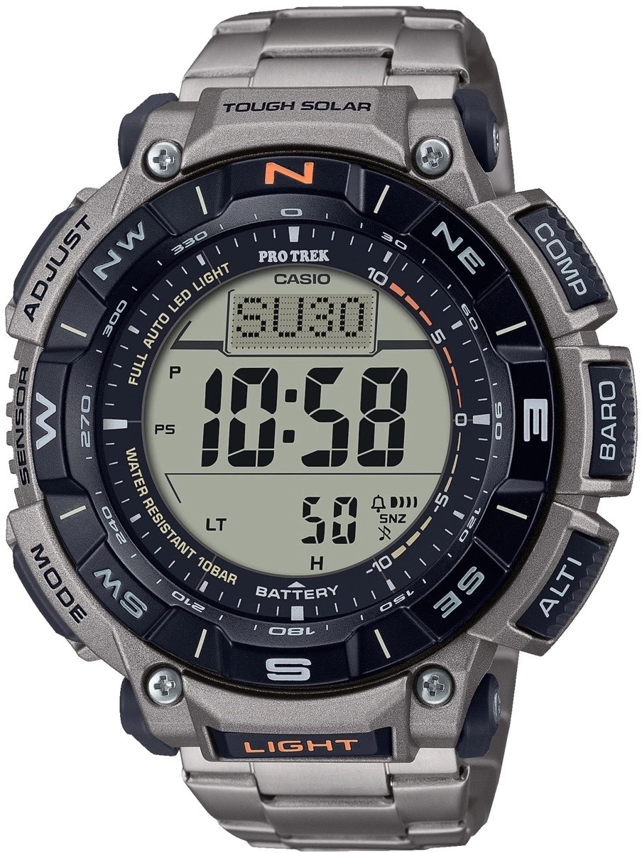 Casio Pro Trek PRG-340T-7ER sind Herren-Solar-Sportuhren mit einem Titanarmband und Klappschließe. Das Gehäuse aus Epoxidharz hat einen Durchmesser von 51,7 Millimetern. Das runde digitale Display mit LED-Hintergrundbeleuchtung wird durch ein Mineralglas geschützt. Der Antrieb der Uhr wird durch ein Werk 3513 mit Solarantrieb und einer Genauigkeit von ±15 Sekunden pro Monat gewährleistet. Die auf Outdoor-Aktivitäten ausgerichteten Uhren verfügen über viele Funktionen, darunter ein Kalender mit Datums-, Wochentags- und Monatsanzeige, Wecker, Stoppuhr, Timer, Weltzeit, Höhenmesser, Thermometer, Barometer, Kompass und Ladezustandsanzeige. Auch die Anzeige der Zeit im 24-Stunden-Format und die Anzeige von Tag und Nacht (Sonnenuntergang und -aufgang) fehlen nicht. Die Uhren sind kältebeständig (bis -10°C) und mit einer Wasserdichtigkeit von 10 ATM zum Schwimmen und Schnorcheln geeignet.