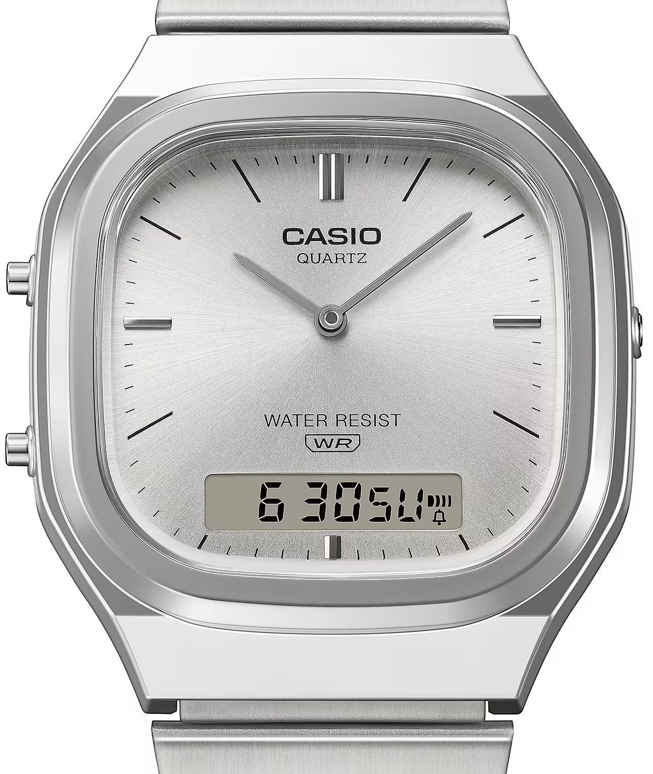 Die Vintage-Kollektion bietet batteriebetriebene Uhren, inspiriert von einer Reihe von Modellen aus der glorreichen Vergangenheit der japanischen Marke. Möchten Sie eine Uhr mit Taschenrechner? Genau in der Vintage-Kollektion können Sie Uhren mit dieser ungewöhnlichen Funktion entdecken. Es gibt viele weitere Stücke mit Retro-Design, hauptsächlich mit digitalem Zifferblatt, aber manchmal auch kombiniert mit Zeigern. Einige Modelle verweisen mit ihrer Form und Gestaltung auf die allerersten Uhren der Marke Casio - den Typ Casiotron. Es ist möglich, aus verschiedenen Materialien und Farbvarianten zu wählen, in denen Casio die einzelnen von der Vergangenheit inspirierten Modelle anbietet.