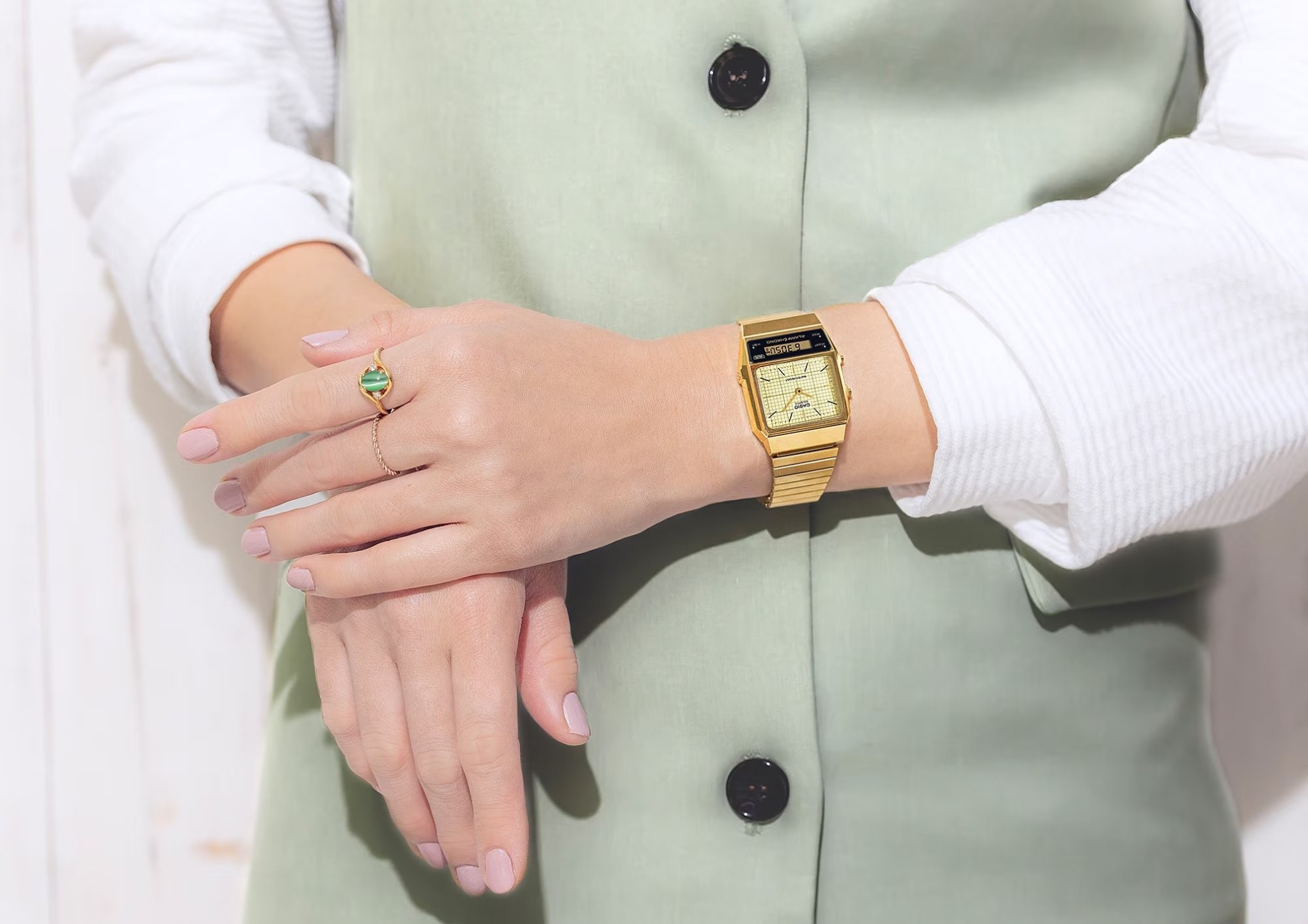 Casio Vintage AQ-800EG-9AEF sind batteriebetriebene Unisex-Uhren im Retro-Design mit einem Stahlarmband mit goldfarbener IP-Beschichtung und einer verstellbaren Schließe. Das eckige Gehäuse aus Epoxidharz misst 32,1 x 40,7 Millimeter und hat ein digitales Display im unteren Bereich. Das analoge Zifferblatt in Goldfarbe mit quadratischem Muster wird durch ein Harzglas geschützt. Der Antrieb der Uhr erfolgt durch ein Quarzwerk 5696 mit einer Genauigkeit von ±30 Sekunden pro Monat. Die Uhr verfügt über viele Funktionen, darunter einen Kalender mit Datums-, Wochentags- und Monatsanzeige, Dualzeit, Wecker, Stoppuhr und die Möglichkeit, die Zeit im 24-Stunden-Format anzuzeigen. Mit einer Wasserdichtigkeit von 3 ATM sind sie regen- und handwaschfest.