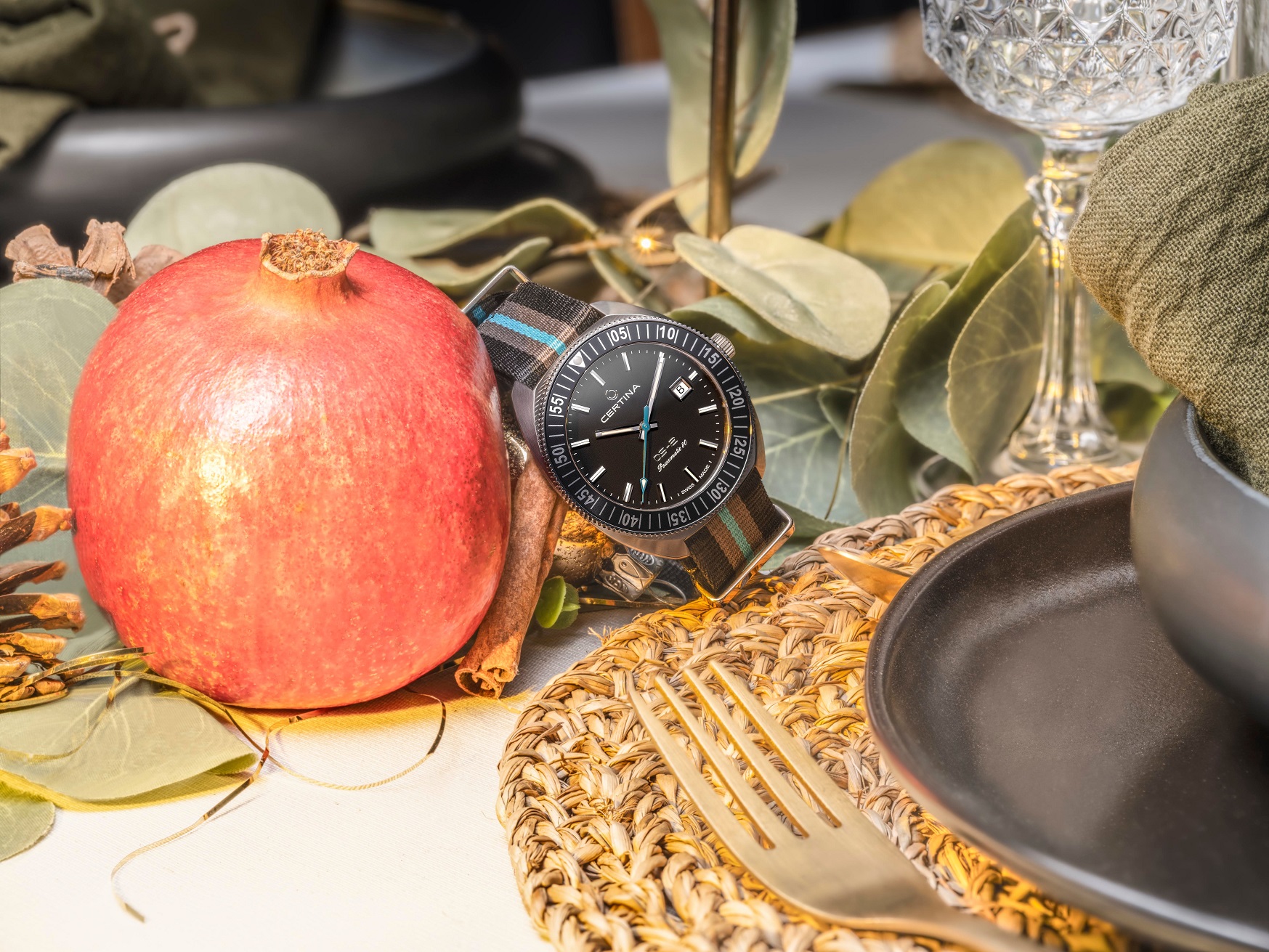 Certina DS-2 C024.607.48.051.10 jsou pánské automatické hodinky na pruhovaném NATO řemínku z materiálu #tide ocean – recyklovaného plastu vyloveného z moře. Hodinky navazují na populární spolehlivý model DS-2 z roku 1968. Jedná se o speciální edici ve spolupráci s nadací Sea Turtle Conservancy, která se zaměřuje na ochranu mořských želv. Pouzdro z nerezové oceli ve tvaru „tonneau“, elipsy zakončené na obou koncích, má průměr 41,1 milimetru, otočnou lunetu s hliníkovou vložkou s minutovou stupnicí a průhledné dýnko opatřené logem nadace Sea Turtle Conservancy. Černý číselník s indikací data je chráněn klenutým safírovým sklem s antireflexní vrstvou. Vintage charakter hodinek zdůrazňují hranaté ručky a hodinové indexy pokryté luminiscenčním nátěrem Super-LumiNova®, který garantuje perfektní čitelnost za zhoršených světelných podmínek. Pohon hodinek zajišťuje mechanický strojek Powermatic 80.611 s automatickým nátahem a rezervou chodu přibližně 80 hodin. Kalibr je vybaven vláskem setrvačky Nivachron™, což je speciální antimagnetický materiál, díky kterému jsou hodinky velmi odolné vůči magnetickým polím. Tento strojek s funkcí hackingu lze v případě potřeby natahovat i ručně pomocí šroubovací korunky. Model disponuje technologií DS (Double Security) používanou a zdokonalovanou již od roku 1959, díky které mají hodinky zvýšenou odolnost vůči nárazům a vodě. Vodotěsnost hodinek činí 20 ATM a jsou vhodnou volbou pro šnorchlování a potápění.