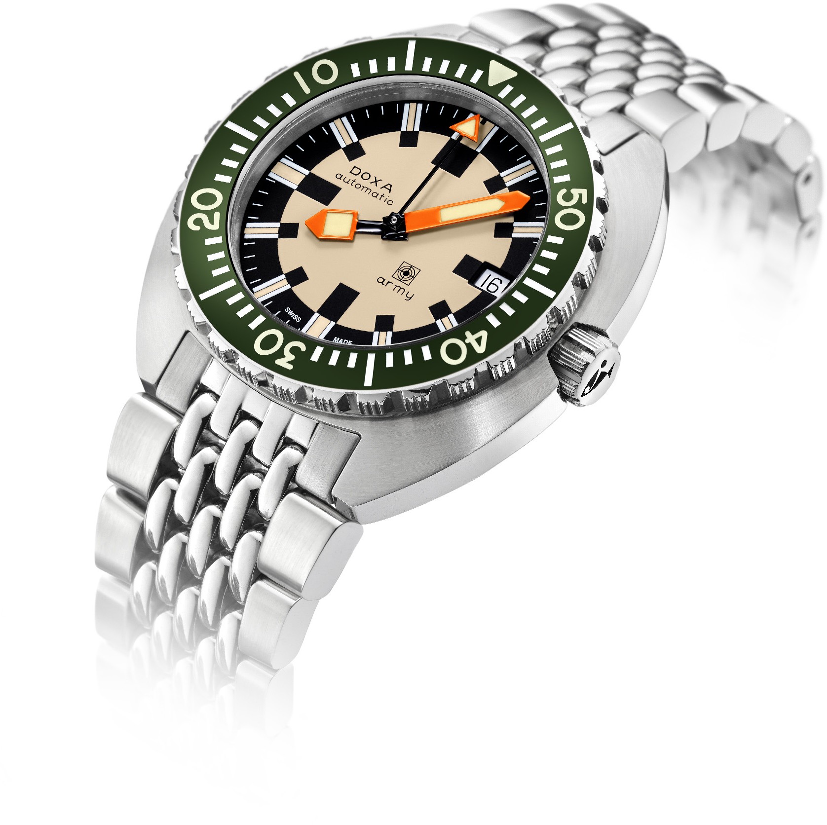 und die Ausstattung mit hochlesbaren orangefarbenen Zeigern. Neben dem Modell SUB 200 sind auch die Typen der Army-Reihe die einzigen, die nicht die für Doxa typische doppelte Skala auf der drehbaren Lünette haben. Die Lünette kann aus Stahl