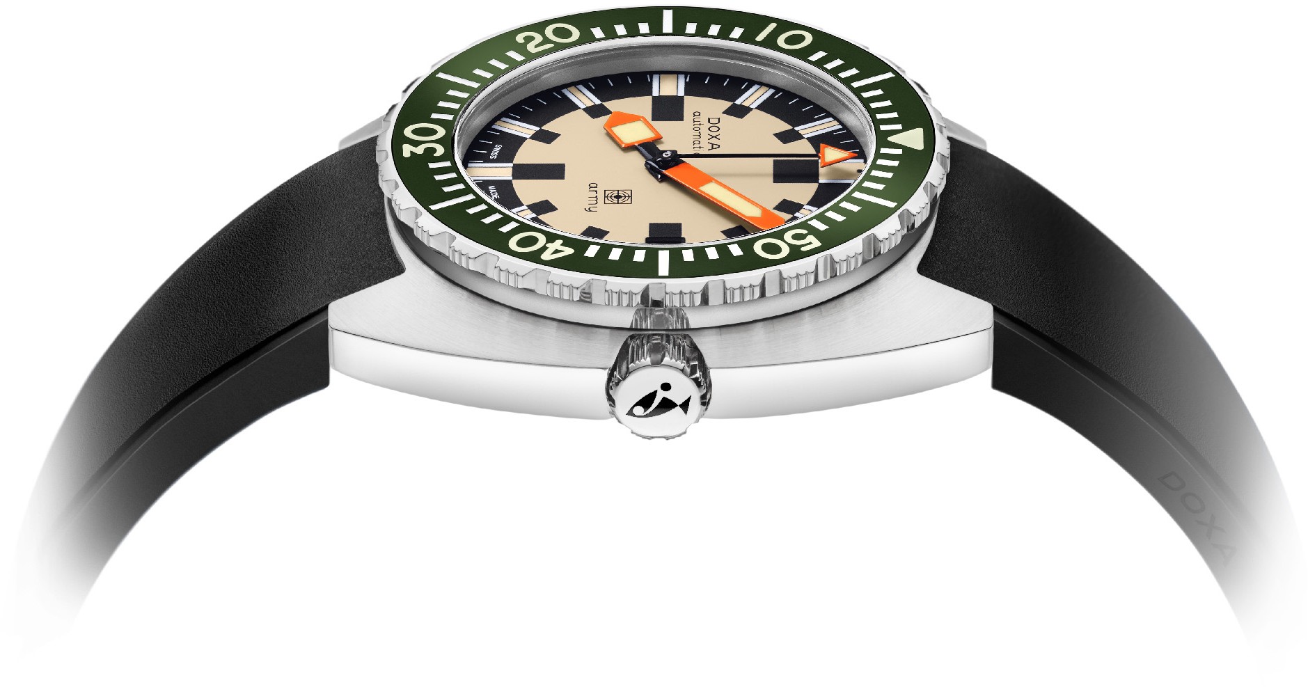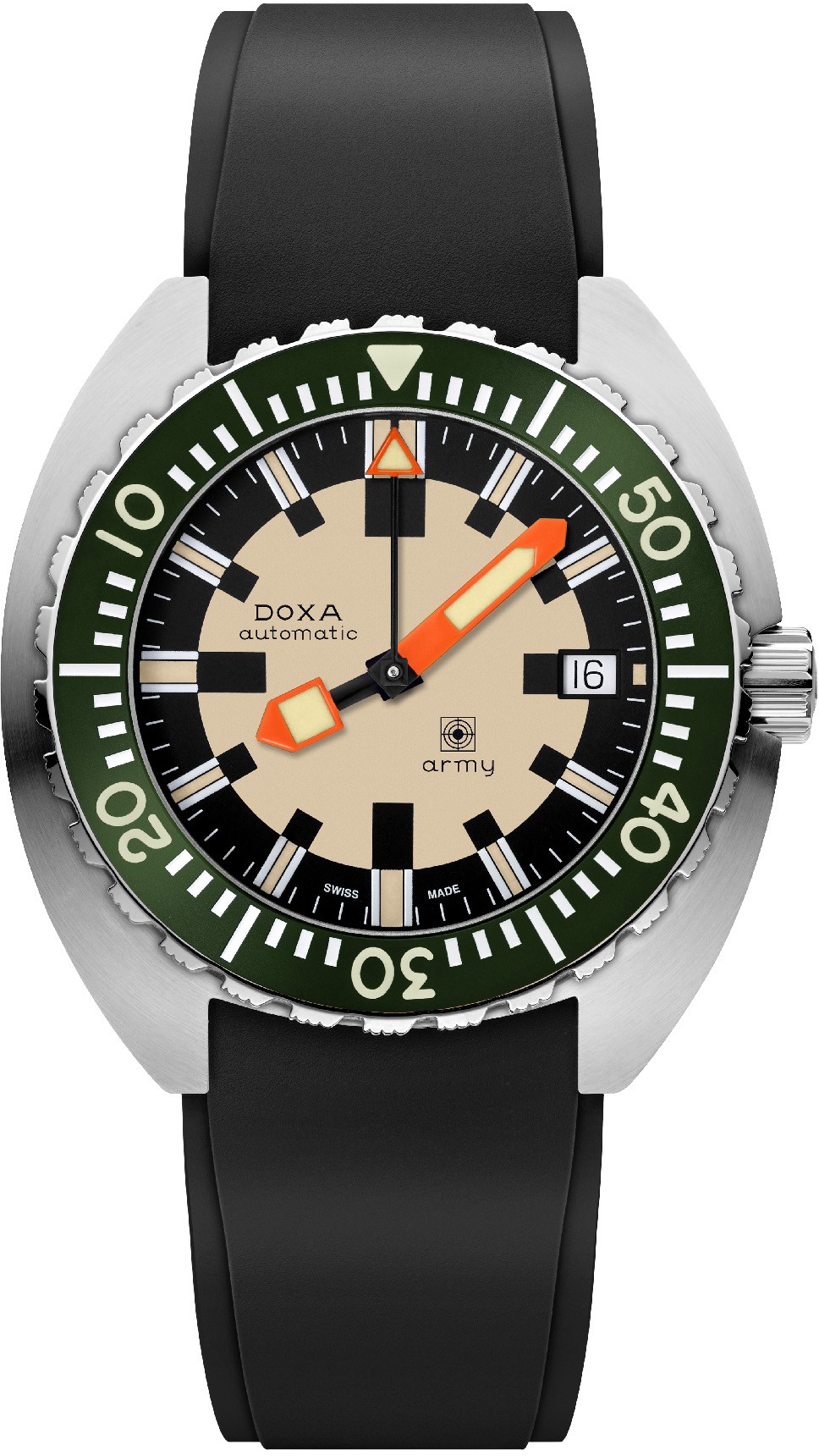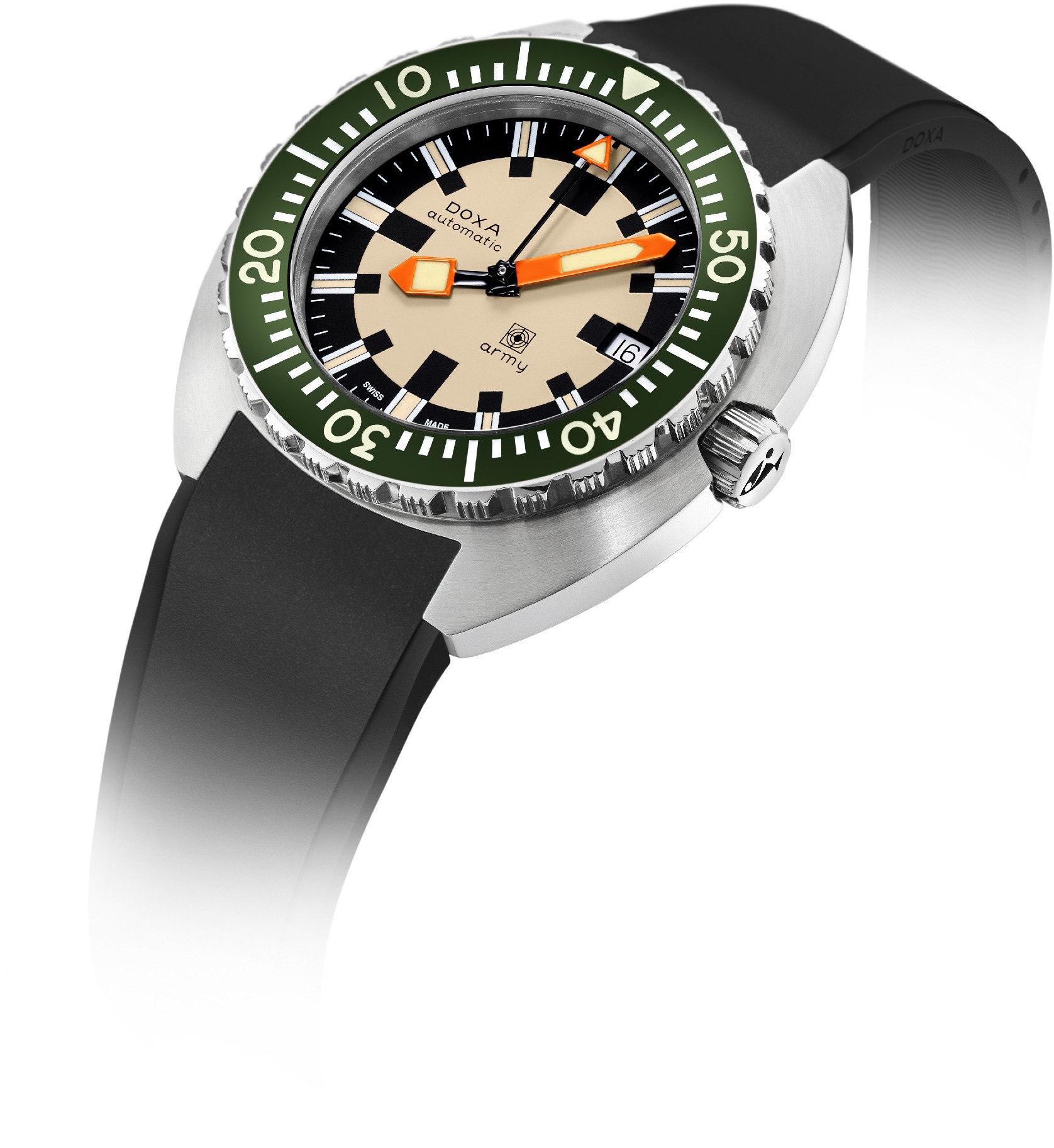 und der Zusammenarbeit mit der Schweizer Armee. Diese kaufte nämlich Doxa-Uhren in den Jahren 1968 – 1979 für ihre Tauchertruppen. Die Army-Modelle beziehen sich genau auf diese historische Zusammenarbeit. Die Ästhetik entspricht den Originalmodellen, jedoch fügt Doxa ihnen heute moderne Verarbeitung