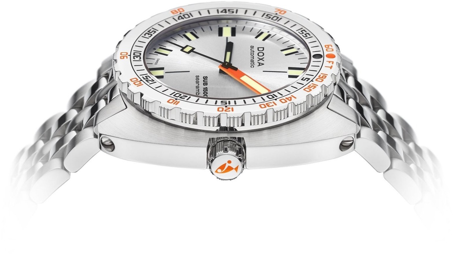 derzeit anbietet. Es folgt den Spuren des ehemaligen Typs 300T Conquistador, jedoch werden seine Eigenschaften dank moderner Technologien noch ein gutes Stück weiterentwickelt. Die Uhr mit einem Gehäuse von 45 Millimetern Durchmesser, verschraubter Krone und Heliumventil bewältigt problemlos Tauchgänge bis zu einer Tiefe von 1500 Metern und ist somit für die härtesten Unterwasserabenteuer bestimmt. Natürlich fehlen ihnen nicht alle charakteristischen Merkmale der Doxa-Taucheruhren, einschließlich der typischen Lünette mit Kombination aus Minutenskala und Fußskala, die es Tauchern ermöglicht, die sicheren Tauchtiefen für das Tauchen ohne Dekompressionsstopps leicht zu überprüfen. Das Modell SUB 1500T ist