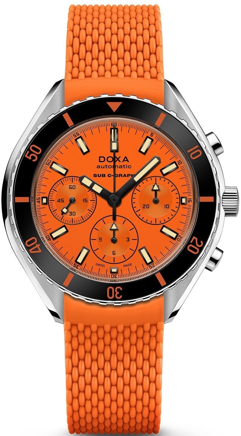 Doxa SUB 200 ist eine junge Modellreihe der Marke, die Firma führte sie im Jahr 2019 als eines der Einstiegsmodelle in die Welt der Taucheruhren ein. Es handelt sich um ein Modell mit klassischem rundem Gehäuse aus Edelstahl (316L), dem eine Reihe typischer Designelemente der Marke Doxa nicht fehlen. Dazu gehören beispielsweise die Lünette mit charakteristischem Relief am Rand, eine auffällige Palette von sieben Farben, einschließlich des ikonischen Orange, auffällige Zeiger und die reichhaltige Nutzung von leuchtenden Elementen. Das Modell Doxa SUB 200 verfügt über eine Wasserbeständigkeit bis zu 200 Metern und ist auf einem Stahlarmband oder einem Gummiband in der Farbe des Zifferblatts erhältlich. Interessierte können in der SUB 200-Reihe aus klassischen Modellen mit einem Gehäusedurchmesser von 42 Millimetern oder einem Paar Chronographen C-Graph und C-Graph II wählen. Während die C-Graph-Modelle einen Gehäusedurchmesser von 45 Millimetern haben, hat der C-Graph II einen traditionelleren Durchmesser von 42 Millimetern.