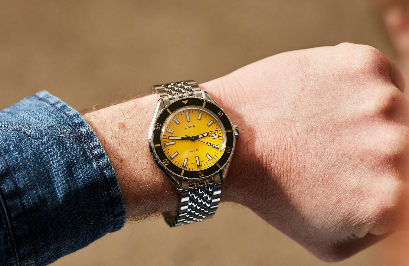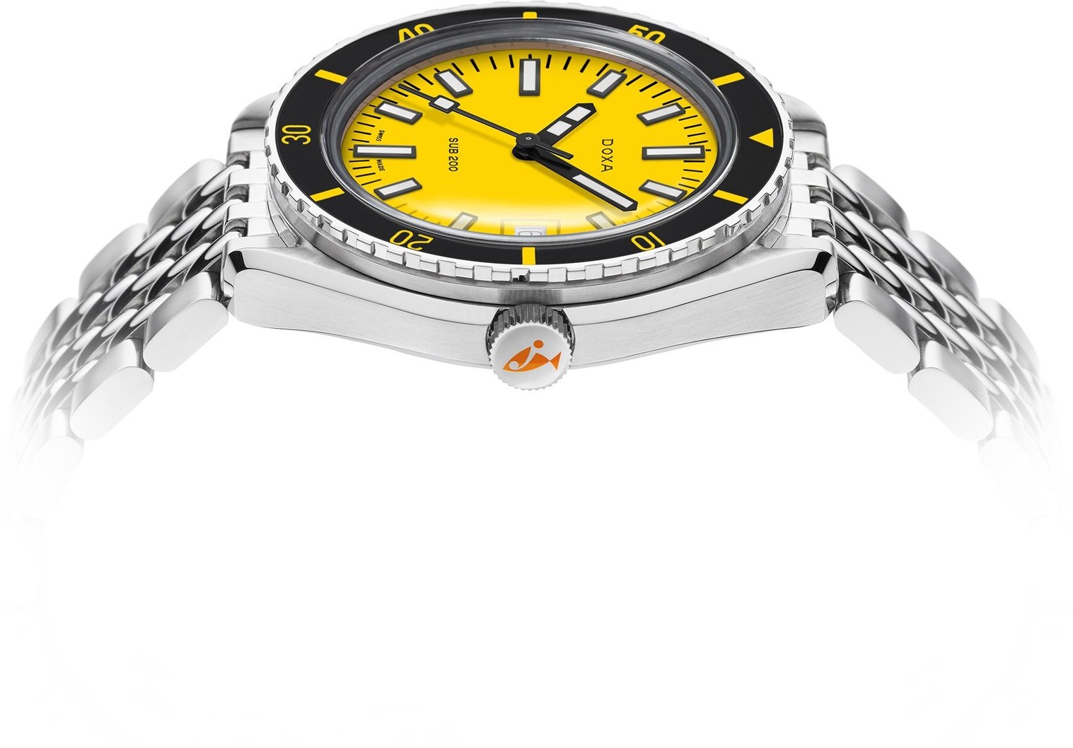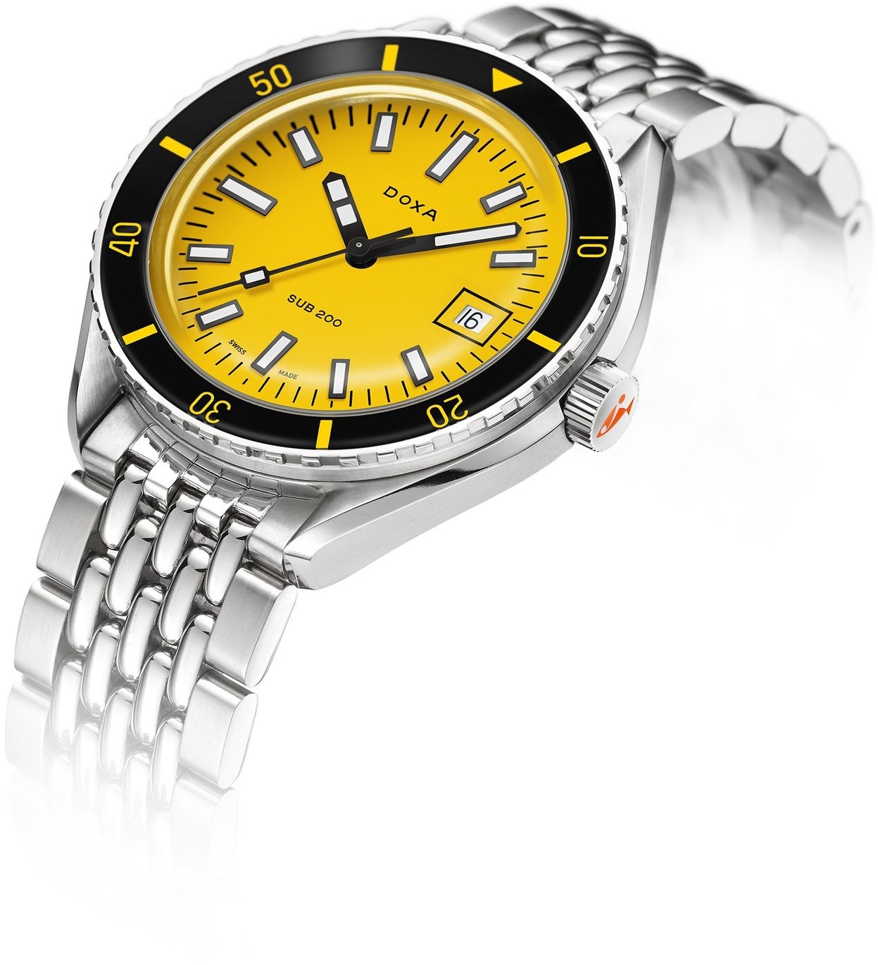 Doxa SUB 200 ist eine junge Modellreihe der Marke, die Firma führte sie im Jahr 2019 als eines der Einstiegsmodelle in die Welt der Taucheruhren ein. Es handelt sich um ein Modell mit klassischem rundem Gehäuse aus Edelstahl (316L), dem eine Reihe typischer Designelemente der Marke Doxa nicht fehlen. Dazu gehören beispielsweise die Lünette mit charakteristischem Relief am Rand, eine auffällige Palette von sieben Farben, einschließlich des ikonischen Orange, auffällige Zeiger und die reichhaltige Nutzung von leuchtenden Elementen. Das Modell Doxa SUB 200 verfügt über eine Wasserbeständigkeit bis zu 200 Metern und ist auf einem Stahlarmband oder einem Gummiband in der Farbe des Zifferblatts erhältlich. Interessierte können in der SUB 200-Reihe aus klassischen Modellen mit einem Gehäusedurchmesser von 42 Millimetern oder einem Paar Chronographen C-Graph und C-Graph II wählen. Während die C-Graph-Modelle einen Gehäusedurchmesser von 45 Millimetern haben, hat der C-Graph II einen traditionelleren Durchmesser von 42 Millimetern.