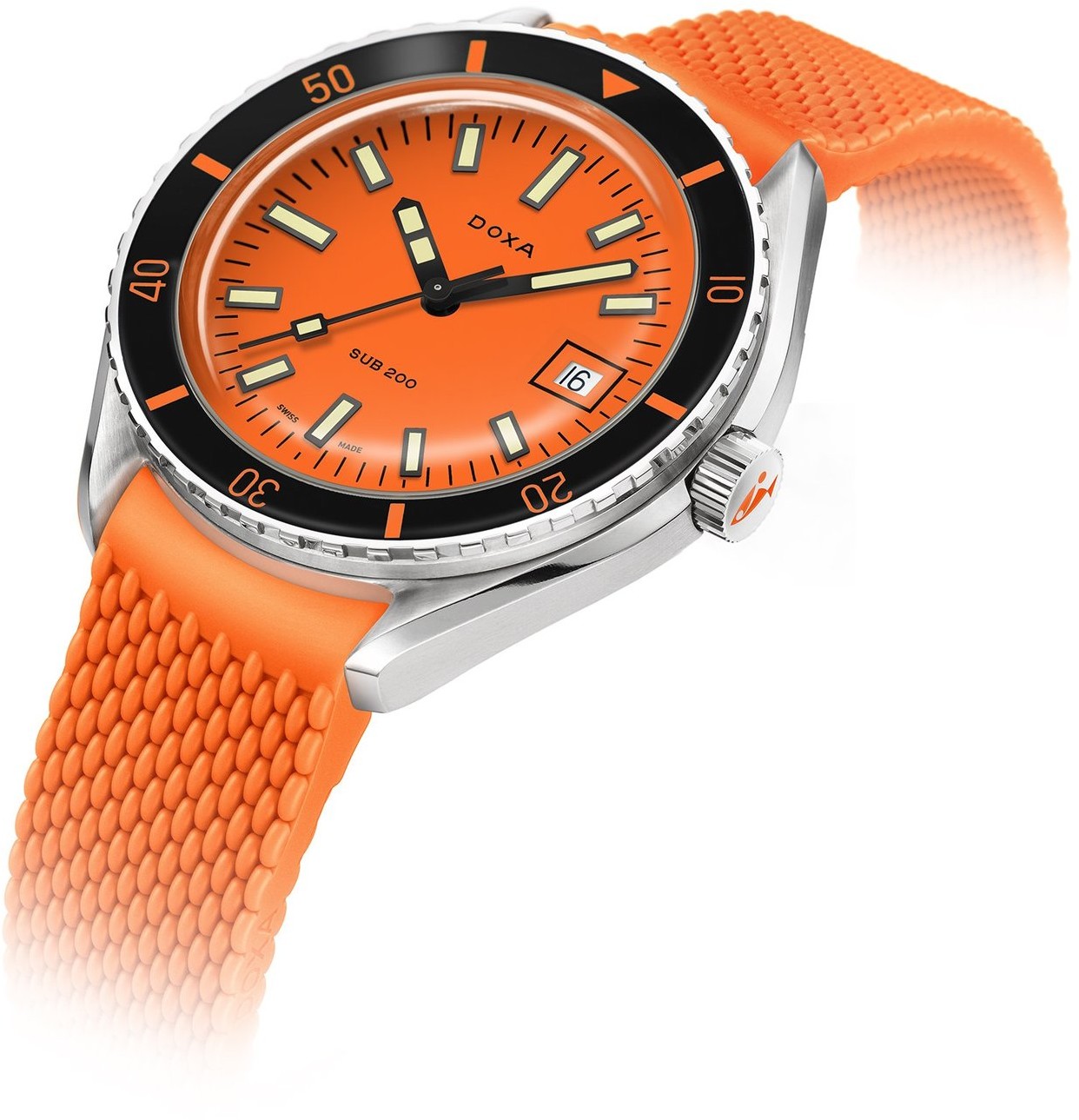 Doxa SUB 200 ist eine junge Modellreihe der Marke, die Firma führte sie im Jahr 2019 als eines der Einstiegsmodelle in die Welt der Taucheruhren ein. Es handelt sich um ein Modell mit klassischem rundem Gehäuse aus Edelstahl (316L), dem eine Reihe typischer Designelemente der Marke Doxa nicht fehlen. Dazu gehören beispielsweise die Lünette mit charakteristischem Relief am Rand, eine auffällige Palette von sieben Farben, einschließlich des ikonischen Orange, auffällige Zeiger und die reichhaltige Nutzung von leuchtenden Elementen. Das Modell Doxa SUB 200 verfügt über eine Wasserbeständigkeit bis zu 200 Metern und ist auf einem Stahlarmband oder einem Gummiband in der Farbe des Zifferblatts erhältlich. Interessierte können in der SUB 200-Reihe aus klassischen Modellen mit einem Gehäusedurchmesser von 42 Millimetern oder einem Paar Chronographen C-Graph und C-Graph II wählen. Während die C-Graph-Modelle einen Gehäusedurchmesser von 45 Millimetern haben, hat der C-Graph II einen traditionelleren Durchmesser von 42 Millimetern.