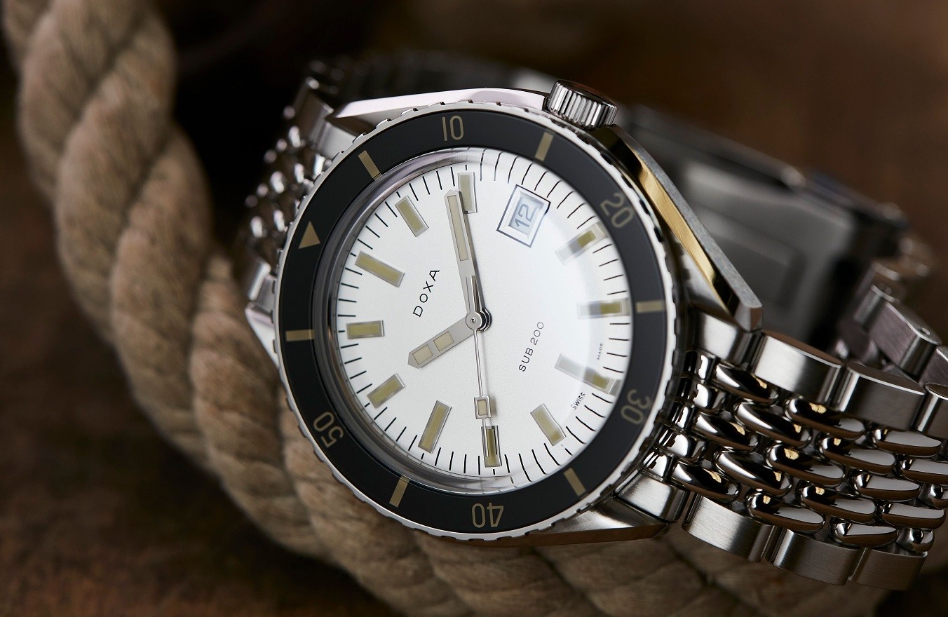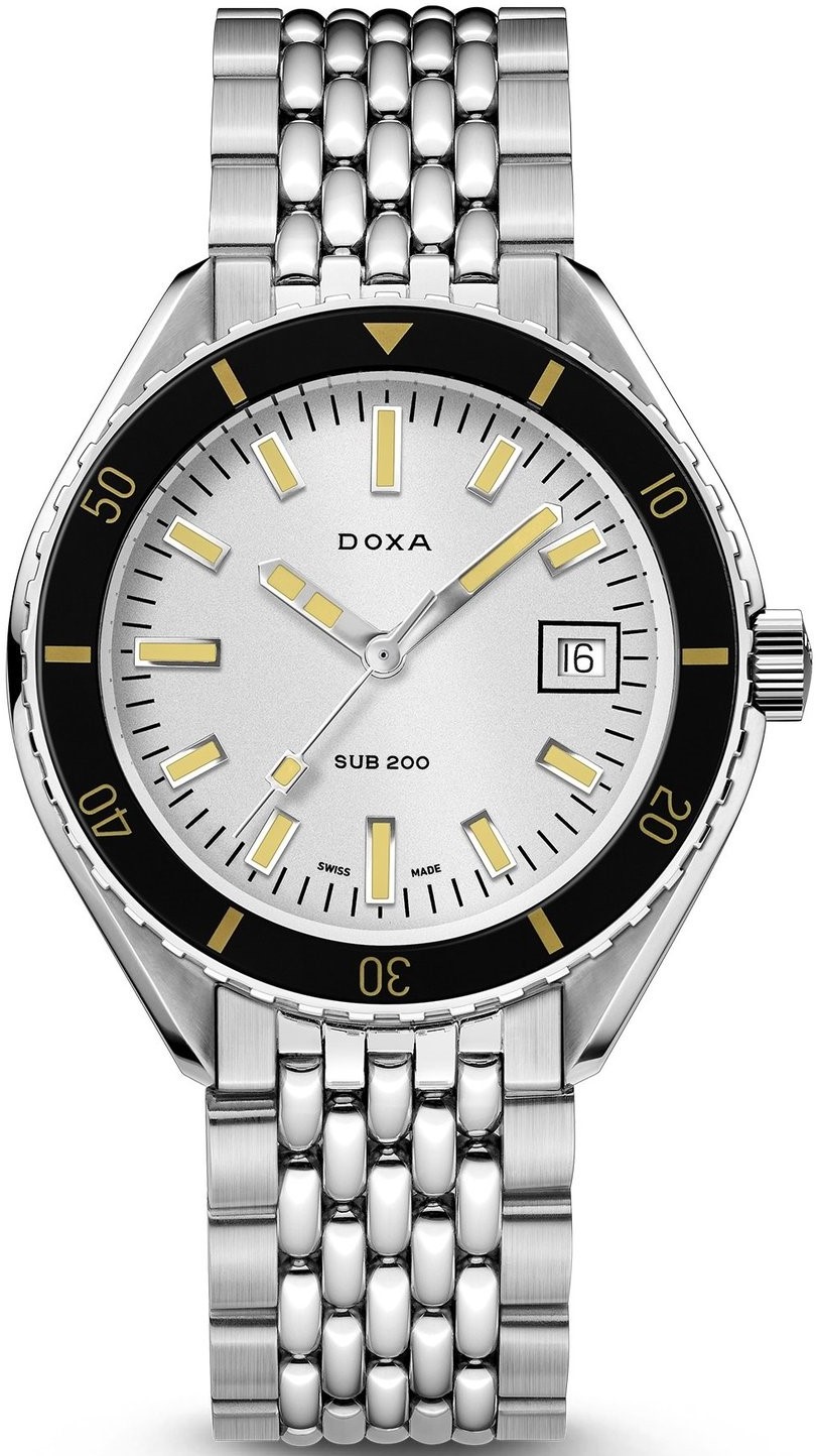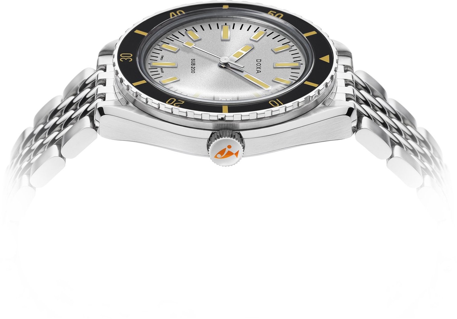 Doxa SUB 200 ist eine junge Modellreihe der Marke, die Firma führte sie im Jahr 2019 als eines der Einstiegsmodelle in die Welt der Taucheruhren ein. Es handelt sich um ein Modell mit klassischem rundem Gehäuse aus Edelstahl (316L), dem eine Reihe typischer Designelemente der Marke Doxa nicht fehlen. Dazu gehören beispielsweise die Lünette mit charakteristischem Relief am Rand, eine auffällige Palette von sieben Farben, einschließlich des ikonischen Orange, auffällige Zeiger und die reichhaltige Nutzung von leuchtenden Elementen. Das Modell Doxa SUB 200 verfügt über eine Wasserbeständigkeit bis zu 200 Metern und ist auf einem Stahlarmband oder einem Gummiband in der Farbe des Zifferblatts erhältlich. Interessierte können in der SUB 200-Reihe aus klassischen Modellen mit einem Gehäusedurchmesser von 42 Millimetern oder einem Paar Chronographen C-Graph und C-Graph II wählen. Während die C-Graph-Modelle einen Gehäusedurchmesser von 45 Millimetern haben, hat der C-Graph II einen traditionelleren Durchmesser von 42 Millimetern.