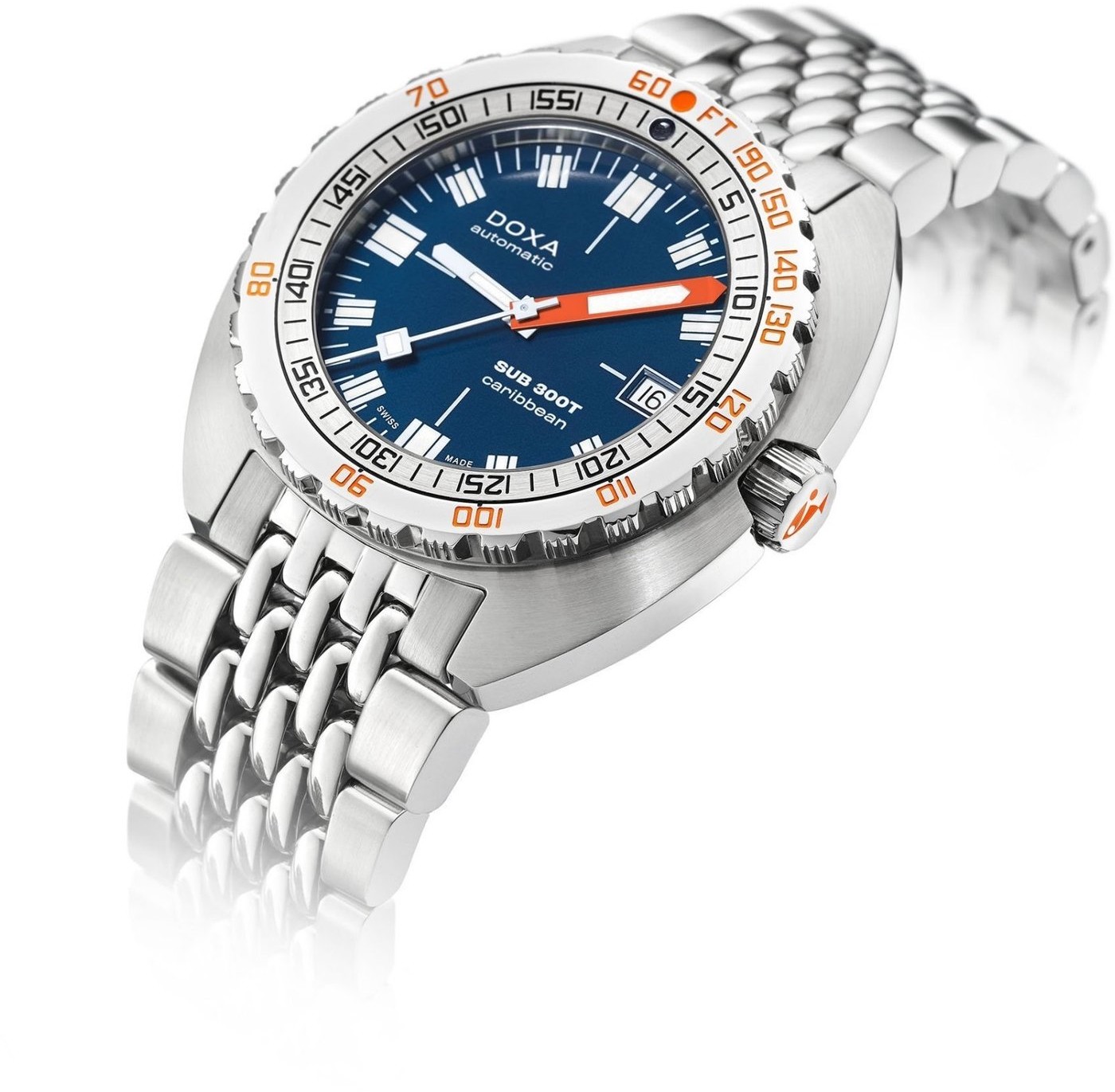 Im Jahr 1968, ein Jahr nach dem ersten wegweisenden Modell SUB 300, führte Doxa ein weiteres erstklassiges Taucheruhrmodell ein, den Typ SUB 300T Conquistador. Dieser unterschied sich vom Typ SUB 300 durch erhöhte Wasserbeständigkeit und zur verschraubten Krone kam auch ein Heliumventil hinzu. Es waren überhaupt die ersten Uhren mit Heliumventil, die für den normalen Verkauf bestimmt waren. Die Doxa SUB 300T Uhren sind eine moderne Interpretation dieser ursprünglichen Ausführung. Sie haben wieder das charakteristische Design der SUB 300-Modelle mit einem kissenförmigen Gehäuse von 42,5 Millimetern Durchmesser. Das Gehäuse hat jedoch aufgrund der erhöhten Wasserbeständigkeit im Vergleich zum Modell SUB 300 leicht veränderte Proportionen, die Dicke wuchs um 0,25 Millimeter auf endgültige 13,65 Millimeter. Auch dank des erwähnten Heliumventils verfügen die Uhren über eine Wasserbeständigkeit bis zu einer Tiefe von 1200 Metern Wassersäule. Die typische Lünette mit Skala zur Ablesung sicherer Tauchzeiten ohne Dekompression ist in Fuß kalibriert und die Modelle in sieben charakteristischen Farben sind wieder