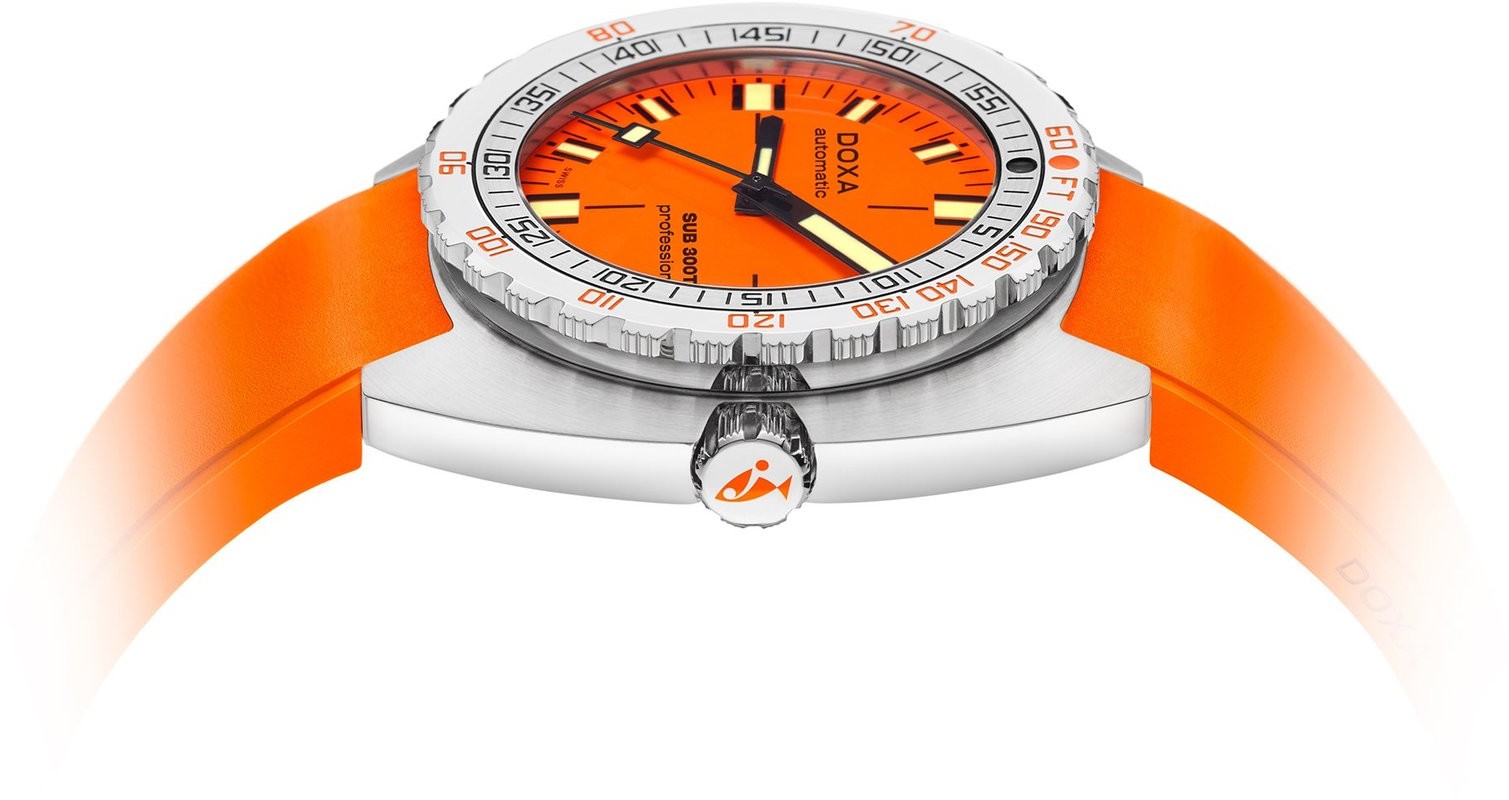 Die moderne Geschichte der Marke Doxa ist jedoch eindeutig mit den Modellen verbunden, die auf dem legendären Typ von Taucheruhren SUB 300 basieren, der 1967 eingeführt wurde. Zu dieser Zeit stellten auch andere Marken Taucheruhren her, aber Doxa arbeitete bei der Entwicklung ihrer Uhren mit professionellen Tauchern zusammen und bereitete ihre Modelle so vor, dass sie für eine breitere Gruppe von Tauchern erschwinglich waren und für sie den größtmöglichen praktischen Nutzen hatten. Daher erhielten die Uhren, an deren Entwicklung unter anderem auch der bekannte Jacques-Yves Cousteau beteiligt war, beispielsweise eine Skala zur Berechnung von Dekompressionszeiten oder die originelle orange Zifferblattfarbe. Übrigens sind Farben eine Besonderheit der Marke Doxa und jede Farbvariante hat ihre klare Bezeichnung: Die Bezeichnung Professional ist für Modelle mit orangefarbenem Zifferblatt reserviert, Sharkhunter steht für schwarzes Zifferblatt, Searambler für silbernes, Caribbean für blaues, Divingstar für gelbes, Aquamarine für türkisfarbenes, Whitepearl für weißes Zifferblatt und die neueste Zifferblattfarbe im Doxa-Portfolio ist grün unter dem Namen Sea Emerald.
