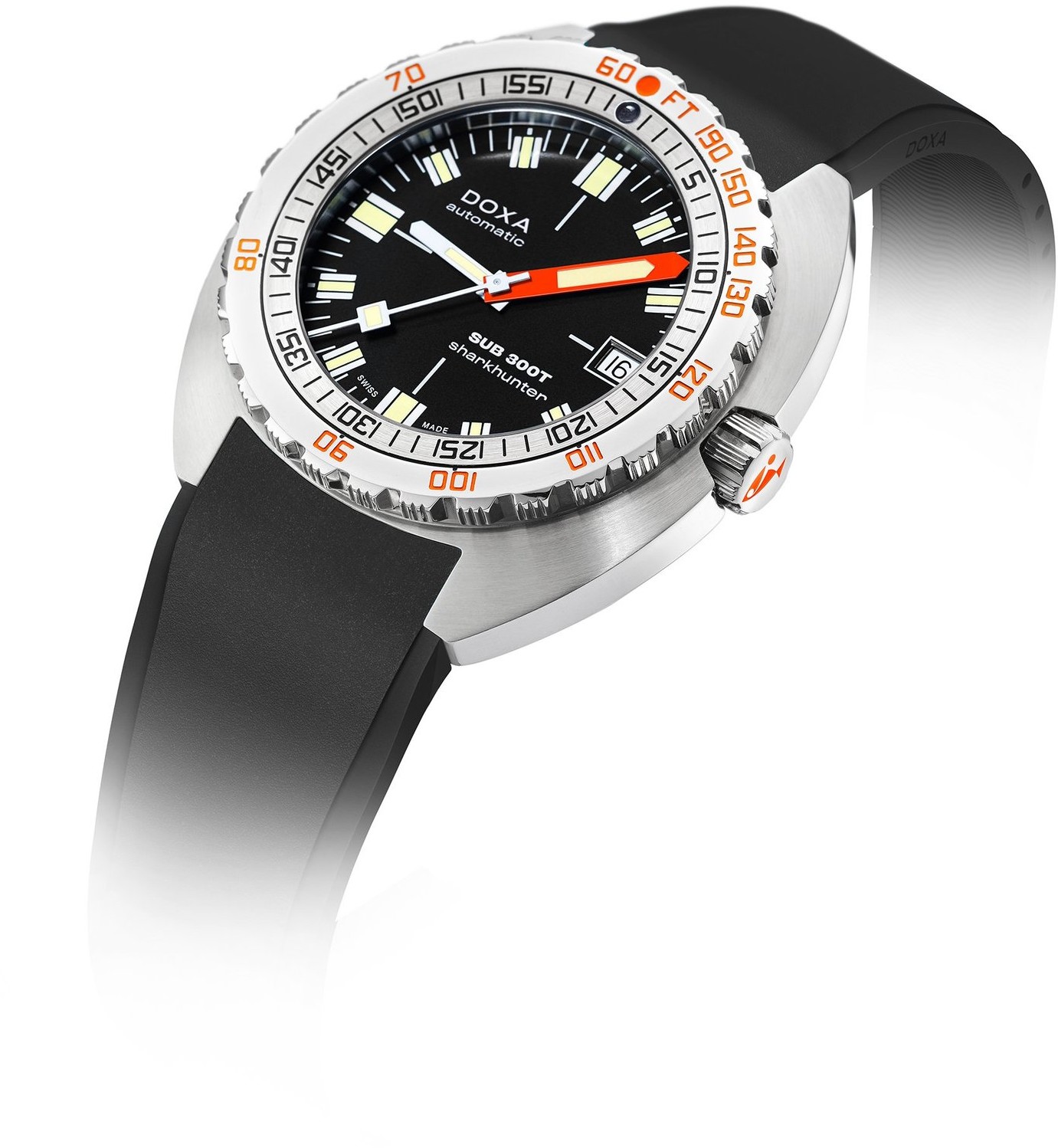 Im Jahr 1968, ein Jahr nach dem ersten wegweisenden Modell SUB 300, führte Doxa ein weiteres erstklassiges Taucheruhrmodell ein, den Typ SUB 300T Conquistador. Dieser unterschied sich vom Typ SUB 300 durch erhöhte Wasserbeständigkeit und zur verschraubten Krone kam auch ein Heliumventil hinzu. Es waren überhaupt die ersten Uhren mit Heliumventil, die für den normalen Verkauf bestimmt waren. Die Doxa SUB 300T Uhren sind eine moderne Interpretation dieser ursprünglichen Ausführung. Sie haben wieder das charakteristische Design der SUB 300-Modelle mit einem kissenförmigen Gehäuse von 42,5 Millimetern Durchmesser. Das Gehäuse hat jedoch aufgrund der erhöhten Wasserbeständigkeit im Vergleich zum Modell SUB 300 leicht veränderte Proportionen, die Dicke wuchs um 0,25 Millimeter auf endgültige 13,65 Millimeter. Auch dank des erwähnten Heliumventils verfügen die Uhren über eine Wasserbeständigkeit bis zu einer Tiefe von 1200 Metern Wassersäule. Die typische Lünette mit Skala zur Ablesung sicherer Tauchzeiten ohne Dekompression ist in Fuß kalibriert und die Modelle in sieben charakteristischen Farben sind wieder
