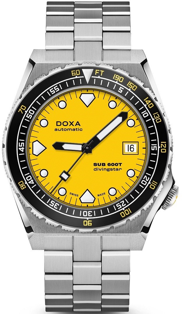 Im Jahr 2021 brachte die Marke Doxa ihr weiteres historisches Modell, den Typ SUB 600T, zurück ins Spiel, das die Firma im Jahr 1980 kurz vor der damaligen Einstellung der Tätigkeit vorstellte. Der wesentliche Unterschied zum Rest des damaligen Portfolios der Marke war ein brandneues Design, das einen anderen Weg einschlug als die Modelle, die auf dem ursprünglichen Typ SUB 300T basierten. Das Modell SUB 600T erhielt moderne, scharf geschnittene Formen und seine moderne Ausführung wird in einem Gehäuse mit einer Größe von 40 Millimetern verwendet. Anders als der Rest der Produktion von Doxa sind auch eine Reihe weiterer Details. Die Krone ist diesmal auf der vierten Stunde platziert und das Stahlarmband hat wieder scharf geschnittene Merkmale und ist dreigliedrig. Eine Alternative dazu ist das NATO-Armband, das garantiert, dass die Uhr am Handgelenk bleibt, auch wenn eine der Stifte versagt. Trotz dieser Unterschiede ist das Modell SUB 600T jedoch wieder klar als Vertreter seiner Marke erkennbar. Dies ist sowohl durch das Angebot an Farbvarianten als auch durch die charakteristische Form der Lünette und ihre doppelte Skala mit Minuten und sicherer Tiefe für das Tauchen ohne Dekompression in Fuß gegeben. Die Lünette kann in der Variante mit Stahl- oder Keramikeinlage gewählt werden. Das Modell SUB 600T verfügt über eine Wasserdichtigkeit bis zu einer Tiefe von 600 Metern.