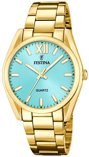 Festina Boyfriend Collection 20640/2 sind Damen-Quarzuhren mit einem Edelstahlarmband mit goldfarbener PVD-Beschichtung und Klappschließe. Diese Uhren im klassischen Design sind für den täglichen Gebrauch geeignet. Das Gehäuse aus poliertem Edelstahl mit goldfarbener PVD-Beschichtung hat einen Durchmesser von 36,8 Millimetern. Das türkisfarbene Zifferblatt mit Sonnenschliff-Effekt ist durch ein widerstandsfähiges Mineralglas geschützt. Die applizierten Stundenindizes und Zeiger sind mit einer lumineszierenden Beschichtung versehen, die eine perfekte Ablesbarkeit bei schlechten Lichtverhältnissen garantiert. Der Antrieb erfolgt durch ein Quarzwerk Miyota 2035. Die Wasserdichtigkeit der Uhr beträgt 5 ATM und ist somit gegen Regen und beim Duschen geschützt.