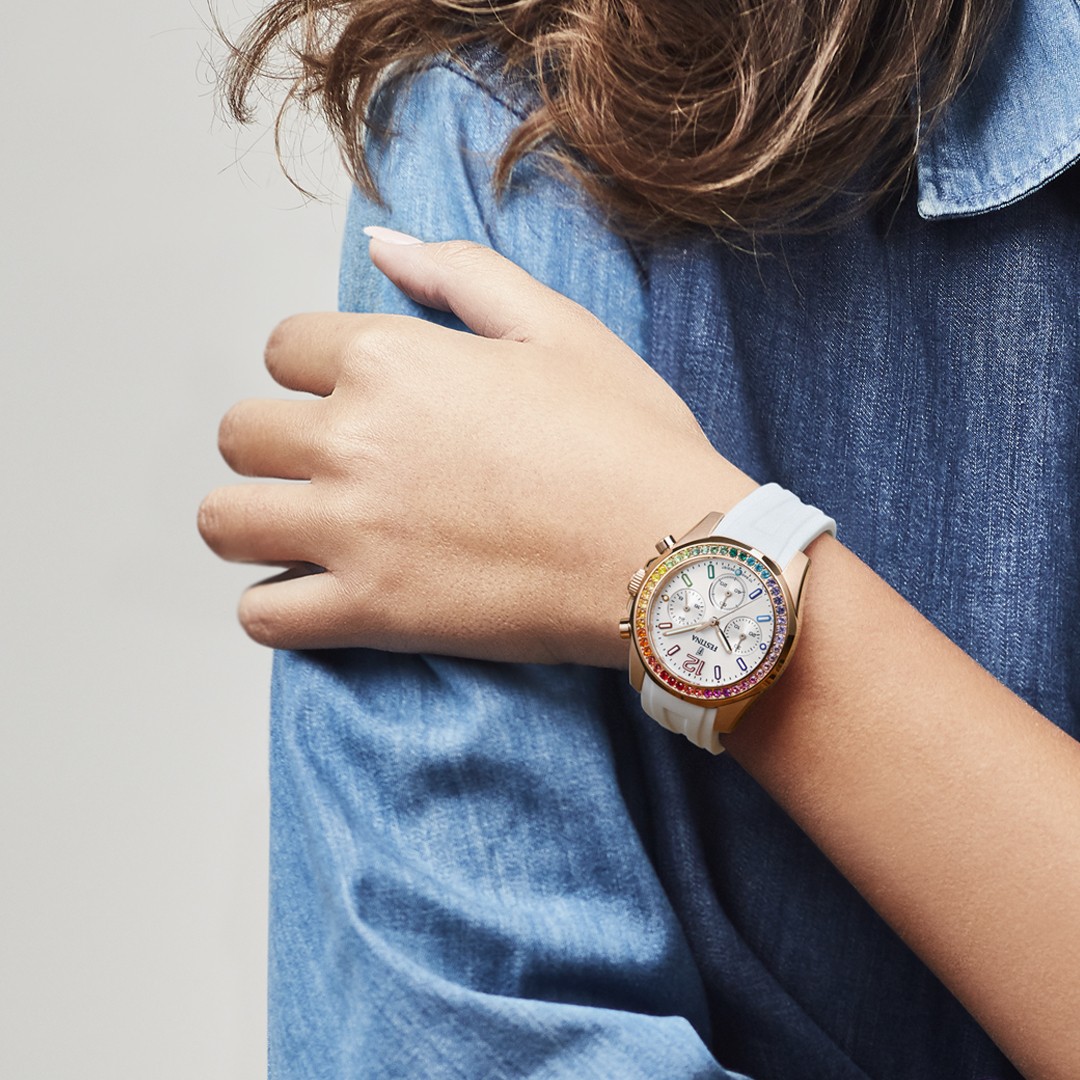 Festina Boyfriend Collection Rainbow 20611/2 sind Damen-Sport-Quarzuhren mit einem weißen Silikonarmband und einer Dornschließe. Das Gehäuse aus Edelstahl mit PVD-Beschichtung in Roségold hat einen Durchmesser von 38,1 Millimetern und eine Lünette, die mit Zirkonen in Regenbogenfarben verziert ist. Das silberne Zifferblatt wird durch ein widerstandsfähiges Mineralglas geschützt. Die einfache Ablesbarkeit im Dunkeln wird durch Zeiger und Indizes mit Leuchtmasse gewährleistet. Die Uhr wird von einem batteriebetriebenen Uhrwerk Miyota JS20-H1 mit Chronographenfunktion und 24-Stunden-Zeitanzeige angetrieben. Mit einer Wasserdichtigkeit von 10 ATM ist sie zum Schwimmen und Schnorcheln geeignet.