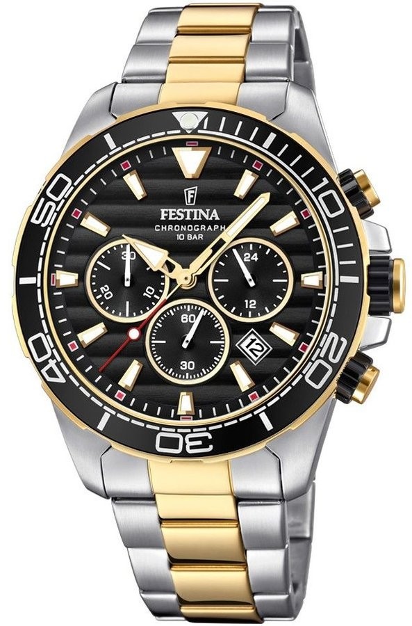 Festina Prestige 20363/3 sind Herren-Sportbatterieuhren mit einem zweifarbigen Stahlarmband mit Klappverschluss. Das Gehäuse aus Edelstahl hat einen Durchmesser von 44,3 Millimetern und eine schwarze Lünette mit Minutenskala. Die Lünette, die Krone, die Chronographenknöpfe und Teile des Armbands sind mit einer PVD-Beschichtung in Goldfarbe versehen. Das schwarze, strukturierte Zifferblatt mit roten Details wird durch ein widerstandsfähiges Mineralglas geschützt. Die Zeiger und Indizes sind mit Leuchtmasse für eine einfache Ablesbarkeit im Dunkeln ausgestattet. Das Uhrwerk wird von einem Quarzwerk Miyota JS25 mit Chronographenfunktion, Datumsanzeige und einer 24-Stunden-Zeitanzeige angetrieben. Mit einer Wasserdichtigkeit von 10 ATM sind die Uhren zum Schwimmen und Schnorcheln geeignet.