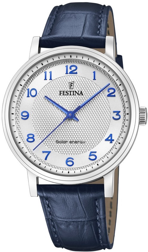 Festina Solar Energy 20660/1 sind elegante Herrenuhren mit einem blauen Lederarmband und einer Dornschließe. Das Edelstahlgehäuse hat einen Durchmesser von 41 Millimetern. Das silberne Zifferblatt mit blauen Details wird durch ein widerstandsfähiges Mineralglas geschützt. Das Uhrwerk wird durch ein Miyota 2170 Quarzwerk mit Solarbetrieb und einer Genauigkeit von ±20 Sekunden pro Monat angetrieben. Die Wasserdichtigkeit beträgt 5 ATM, was bedeutet, dass sie gegen Regen und beim Duschen geschützt sind.