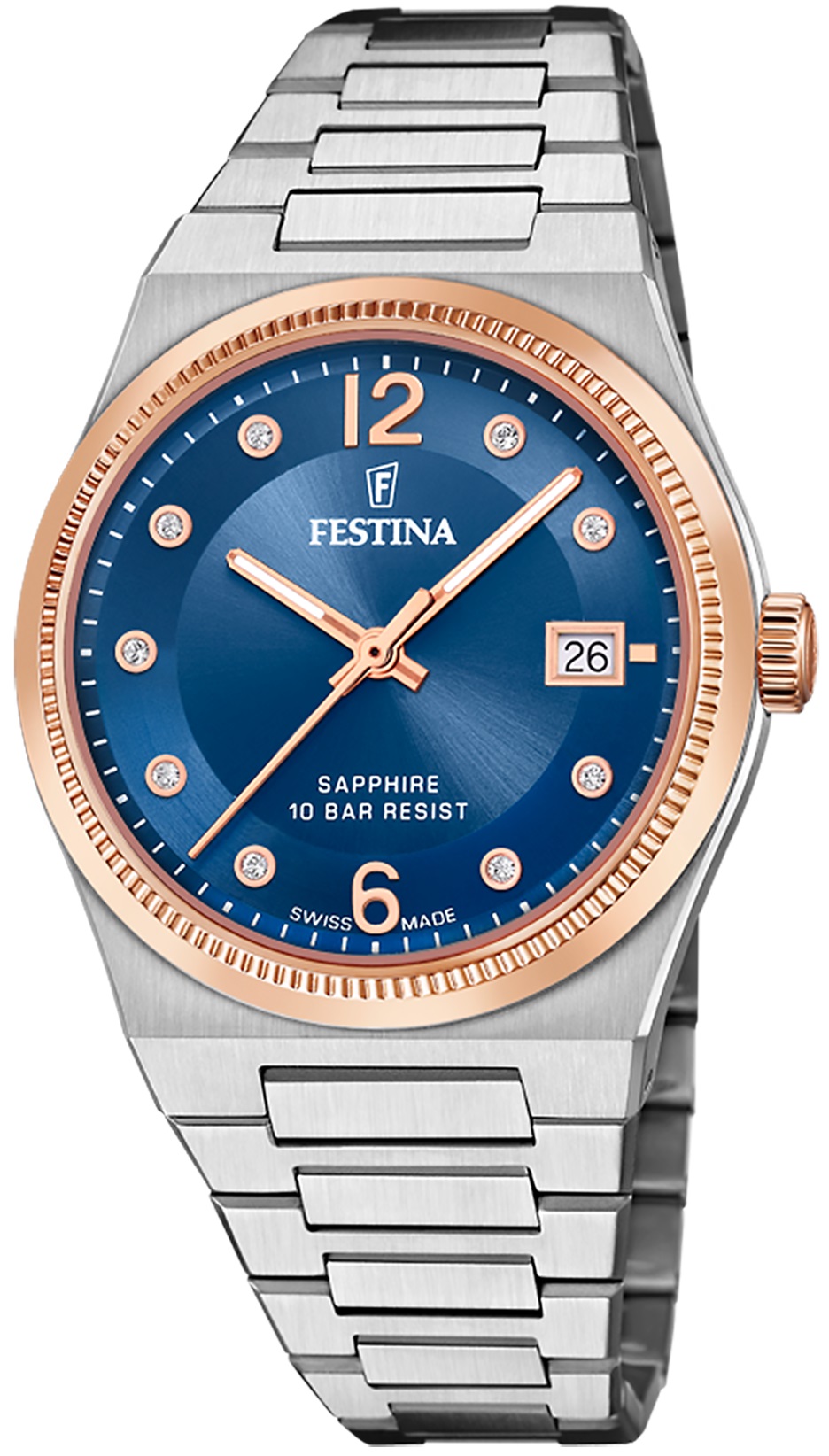 Festina Swiss Made 20037/2 sind Damen-Quarzuhren im klassischen Stil mit einem Stahlarmband und einer Schmetterlingsschließe. Das Gehäuse aus Edelstahl mit einem Durchmesser von 35 Millimetern hat eine Lünette und eine Krone mit einer PVD-Beschichtung in Roségoldfarbe, die zu den Zeigern und Indizes passt. Das übersichtliche blaue Zifferblatt mit Sonnenschliff-Effekt, 9 Zirkonen und Datumsanzeige auf der Drei-Uhr-Position ist durch ein widerstandsfähiges Saphirglas geschützt. Die Zeiger haben einen leuchtenden Anstrich, der nach Aufladung die Lesbarkeit bei schlechten Lichtverhältnissen erleichtert. Das Uhrwerk wird durch ein Quarzwerk Ronda 715 angetrieben. Mit einer Wasserdichtigkeit von 10 ATM sind die Uhren zum Schwimmen oder Schnorcheln geeignet.
