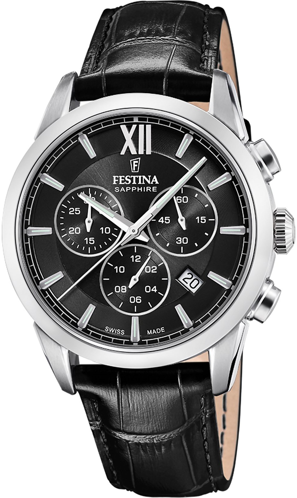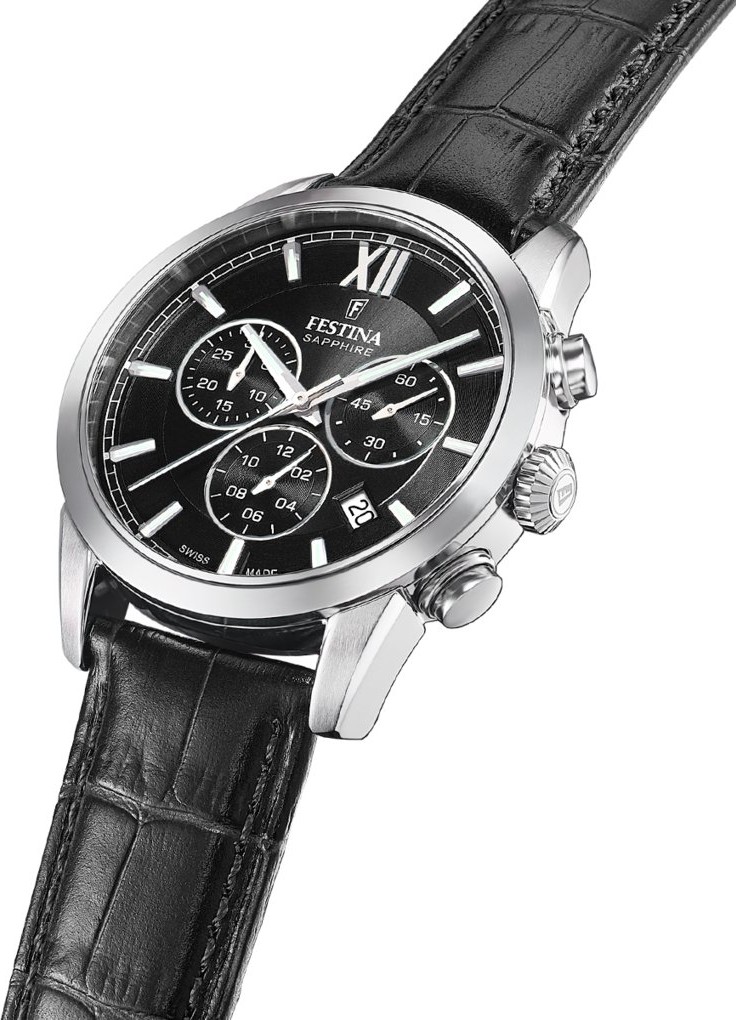 Festina Swiss Made 20041/4 sind sportlich-elegante Herren-Quarzuhren mit einem schwarzen Lederarmband mit Dornschließe. Das Edelstahlgehäuse hat einen Durchmesser von 41 Millimetern. Das schwarze Zifferblatt mit Sonnenschliff-Effekt, Datumsanzeige und Stoppuhr ist durch ein widerstandsfähiges Saphirglas geschützt. Aufgebrachte Indizes und Zeiger haben eine Leuchtbeschichtung, die nach dem Aufladen die Lesbarkeit bei schlechten Lichtverhältnissen erleichtert. Der Antrieb der Uhr erfolgt durch das Quarzuhrwerk Ronda 5030.D. Mit einer Wasserdichtigkeit von 10 ATM sind die Uhren zum Schwimmen oder Schnorcheln geeignet.