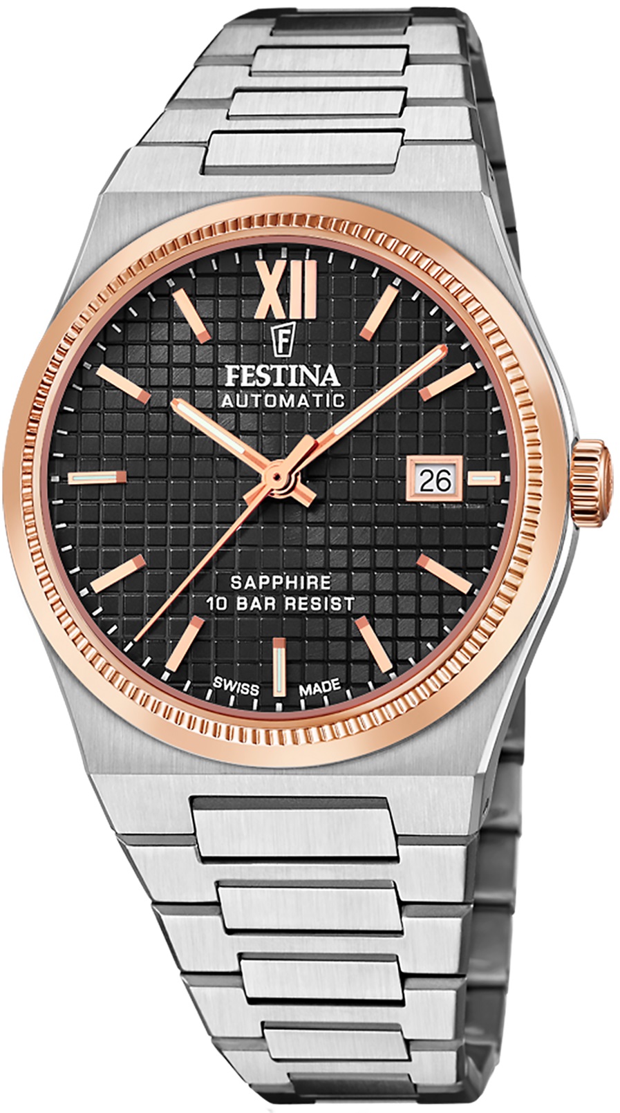 Festina Swiss Made 20030/3 sind klassische Herren-Automatikuhr mit einem Stahlarmband und einer Faltschließe. Das Edelstahlgehäuse mit einem Durchmesser von 40 Millimetern hat eine Lünette und Krone mit einer PVD-Beschichtung in Roségoldfarbe und einem transparenten Gehäuseboden. Das schwarze Zifferblatt mit Waffelmuster, Sonnenschliff-Effekt und Datumsanzeige auf der Drei-Uhr-Position wird durch ein widerstandsfähiges Saphirglas geschützt. Die Zeiger und einige Indizes haben eine lumineszierende Beschichtung, die nach dem Aufladen die Lesbarkeit bei schlechten Lichtverhältnissen erleichtert. Der Lauf der Uhr wird durch ein mechanisches Uhrwerk P024-3h201 mit automatischem Aufzug und einer Gangreserve von 38 Stunden gewährleistet. Mit einer Wasserdichtigkeit von 10 ATM sind die Uhren für das Schwimmen oder Schnorcheln geeignet.
