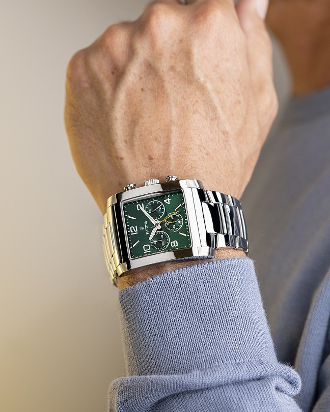 Festina Timeless Chronograph 20635/3 sind Herren-Sportbatterieuhren mit einem Stahlarmband mit Klappverschluss. Das quadratische Gehäuse aus Edelstahl hat einen Durchmesser von 38 Millimetern. Das grüne Zifferblatt mit Sonnenschliff-Effekt, Stoppuhr und 24-Stunden-Zeitanzeige ist durch ein Mineralglas geschützt. Die Zeiger und Indizes verfügen über eine lumineszierende Beschichtung, die nach dem Aufladen die Lesbarkeit bei schlechten Lichtverhältnissen erleichtert. Die Uhr wird von einem Quarzwerk Miyota JS20 mit einer Genauigkeit von ±20 Sekunden pro Monat angetrieben. Mit einer Wasserdichtigkeit von 5 ATM ist die Uhr gegen Regen und beim Duschen geschützt.