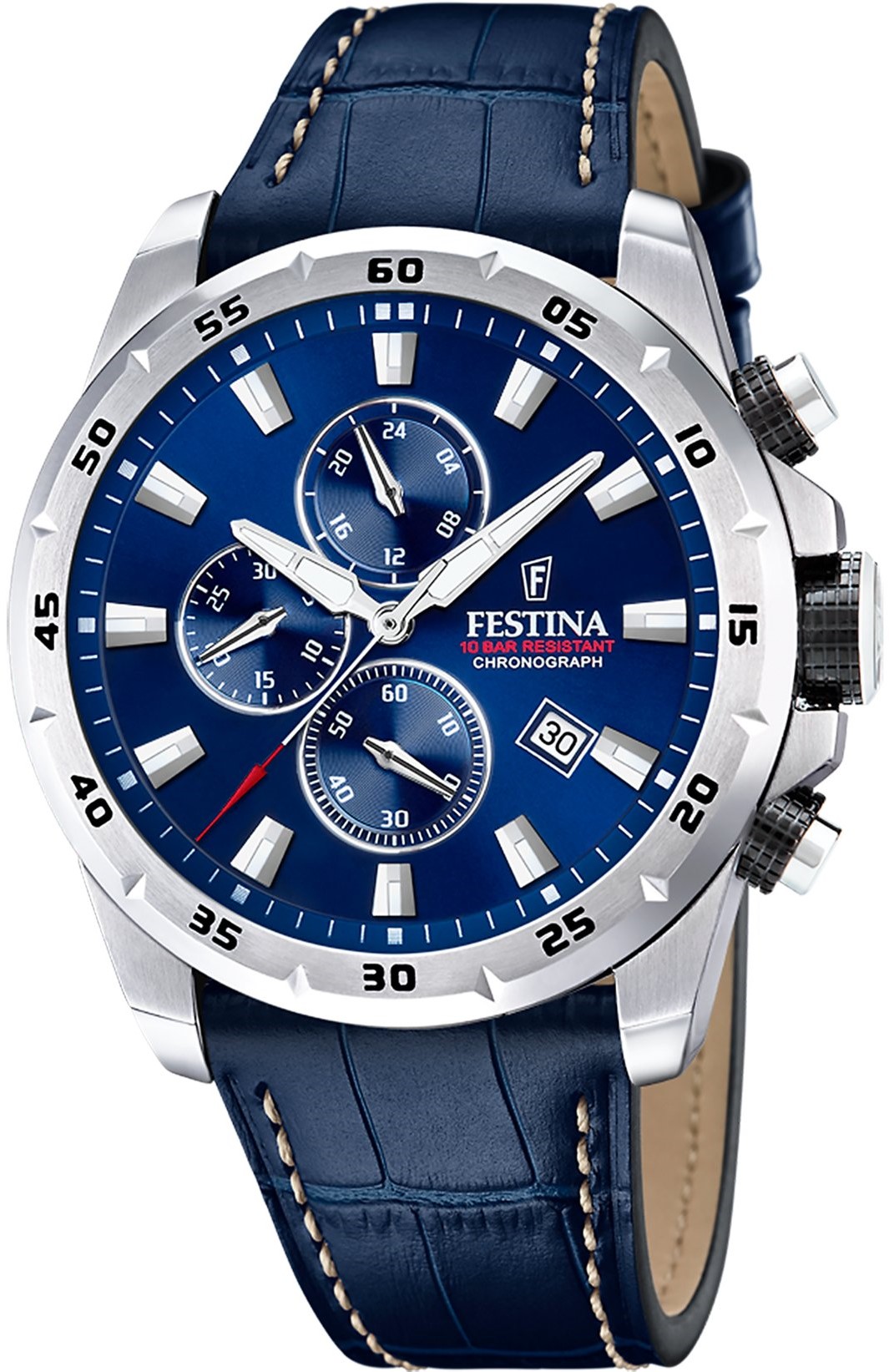 Festina Timeless Chronograph 20692/2 sind sportlich-elegante Herren-Quarzuhren mit einem blauen Lederarmband mit kontrastierenden Nähten und Dornschließe. Das Edelstahlgehäuse hat einen Durchmesser von 45,05 Millimetern und eine Lünette mit Minutenskala. Das blaue Zifferblatt mit Sonnenschliff-Effekt, Datumsanzeige, Stoppuhr und 24-Stunden-Anzeige ist durch ein Mineralglas geschützt. Die Zeiger und Indizes sind mit einer Leuchtbeschichtung versehen, die nach dem Aufladen die Lesbarkeit bei schlechten Lichtverhältnissen erleichtert. Die Uhr wird von einem Quarzwerk Miyota JS15 mit einer Genauigkeit von ±20 Sekunden pro Monat angetrieben. Mit einer Wasserdichtigkeit von 10 ATM ist die Uhr zum Schwimmen und Schnorcheln geeignet.