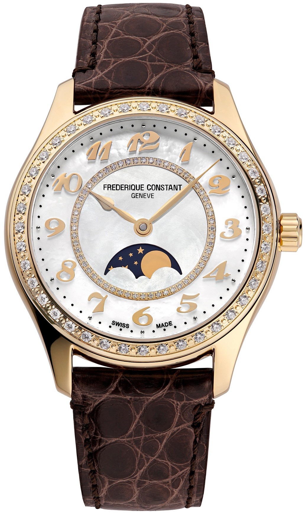 Frederique Constant Classics Elegance FC-331MPWD3BD5 sind Damen-Automatikuhr mit braunem Alligatorlederarmband und Faltschließe. Das Edelstahlgehäuse mit goldfarbener PVD-Beschichtung hat einen Durchmesser von 36 Millimetern, einen transparenten Gehäuseboden, eine signierte Krone und eine Lünette, die mit 40 Diamanten von 0,47 ct besetzt ist. Das Perlmuttzifferblatt mit Mondphasenanzeige und 56 Diamanten von 0,7 ct wird von einem widerstandsfähigen Saphirglas geschützt und seine Schönheit kommt besonders bei direktem Licht zur Geltung, wenn man das Farbspiel des Perlmutts beobachten kann. Applizierte Stundenindizes werden durch elegante Blattzeiger ergänzt. Der Antrieb der Uhr erfolgt durch das mechanische Kaliber FC-331 mit automatischem Aufzug und einer Gangreserve von etwa 38 Stunden. Die Basis des Kalibers ist die Sellita SW280. Dieses Kaliber mit der Hacking-Funktion kann bei Bedarf auch manuell über die Krone aufgezogen werden. Mit einer Wasserdichtigkeit von 5 ATM ist die Uhr gegen Regen und beim Duschen widerstandsfähig.