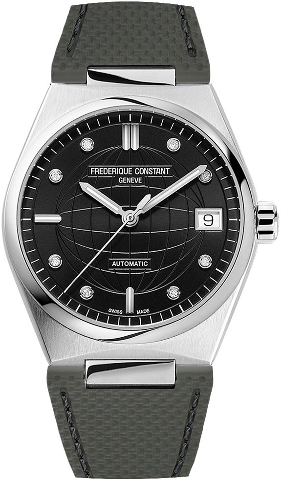 Frederique Constant Highlife Ladies Automatic FC-303BD2NH6B sind Damen-Automatikuhr mit einem integrierten Edelstahlarmband in einer Kombination aus Matt- und Glanzfinish mit einer Faltschließe. Das Edelstahlgehäuse hat einen Durchmesser von 34 Millimetern, eine signierte Krone und einen transparenten Gehäuseboden. Diese universellen Uhren im klassischen Design eignen sich für den täglichen Gebrauch. Das schwarze Zifferblatt mit Globusmotiv, verziert mit 8 Diamanten mit einem Gewicht von 0,04 ct, wird durch ein widerstandsfähiges Saphirglas geschützt. Die aufgetragenen Stundenindizes sind zusammen mit den Zeigern mit einer lumineszierenden Beschichtung Super-LumiNova® überzogen, die eine perfekte Ablesbarkeit bei schlechten Lichtverhältnissen garantiert. Der Antrieb der Uhr erfolgt durch ein mechanisches Werk FC-303 mit automatischem Aufzug und einer Gangreserve von etwa 38 Stunden. Die Basis des Kalibers ist die Sellita SW200. Dieses Werk mit Hacking-Funktion kann bei Bedarf auch manuell über die Krone aufgezogen werden. Die Uhren verfügen über eine Datumsanzeige und sind mit einer Wasserdichtigkeit von 5 ATM gegen Regen und beim Duschen geschützt. Zum Lieferumfang gehört ein zusätzliches Kautschukarmband.