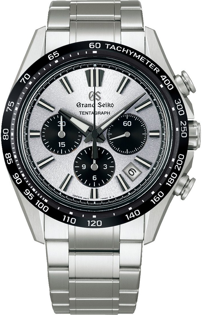 Grand Seiko Evolution 9 The Tentagraph SLGC007G sind luxuriöse Herren-Sportautomatikuhr mit einem Titanarmband und einer Faltschließe. Das Titangehäuse hat einen Durchmesser von 43,2 Millimetern, eine verschraubte Krone, einen transparenten Gehäuseboden und eine schwarze Keramiklünette mit Tachymeterskala. Das silberne, texturierte Zifferblatt mit Sonnenschliff-Effekt, Datumsanzeige und schwarzen Subzifferblättern der Stoppuhr wird durch ein widerstandsfähiges Saphirglas mit Antireflexbeschichtung geschützt. Das Design des Zifferblatts soll den mit frischem Schnee bedeckten Berg Iwate darstellen, der vom Grand Seiko Studio Shizukuishi aus sichtbar ist. Das Reliefmuster des Zifferblatts ist inspiriert von den Graten dieses Berges. Die Zeiger und Indizes sind mit einer Leuchtbeschichtung LumiBrite versehen, die nach Beleuchtung eine perfekte Lesbarkeit bei schlechten Lichtverhältnissen garantiert. Der Antrieb der Uhr erfolgt durch ein mechanisches Kaliber 9SC5 mit automatischem Aufzug und einer Gangreserve von 72 Stunden. Dieses Kaliber mit Hacking-Funktion kann bei Bedarf auch manuell über die signierte Krone aufgezogen werden. Mit einer Wasserdichtigkeit von 10 ATM ist die Uhr zum Schwimmen und Schnorcheln geeignet.