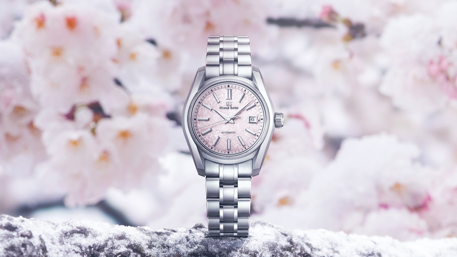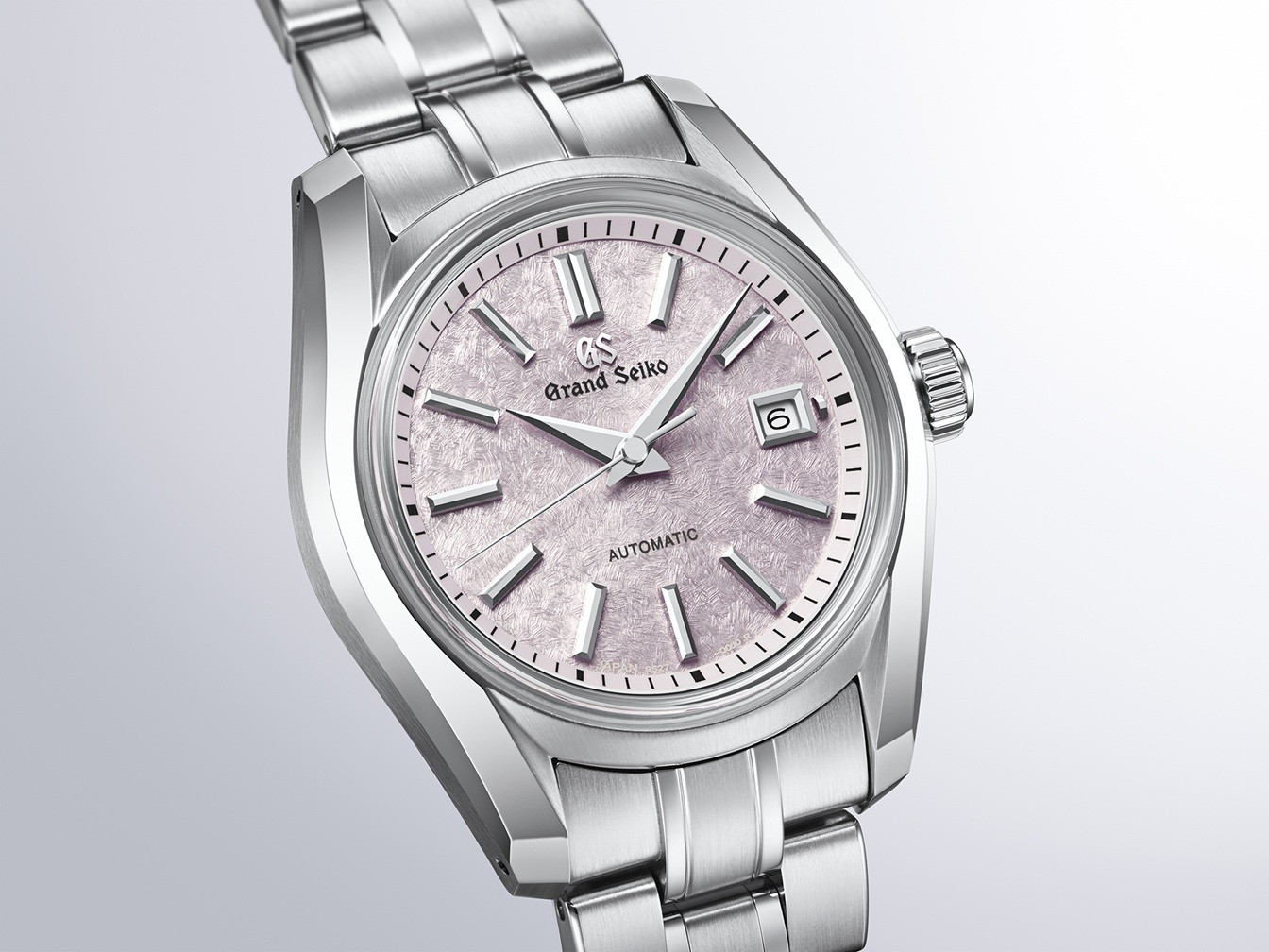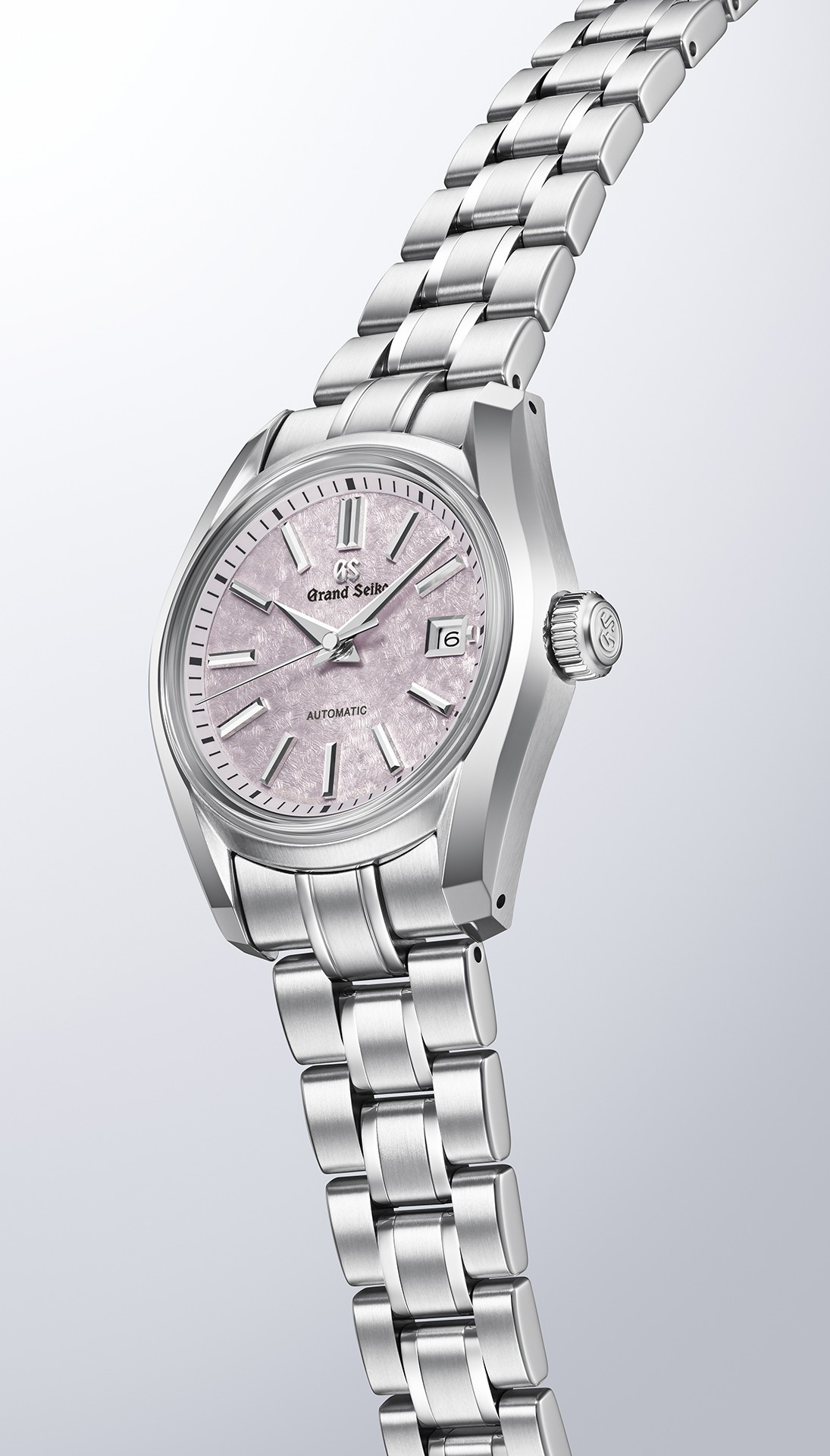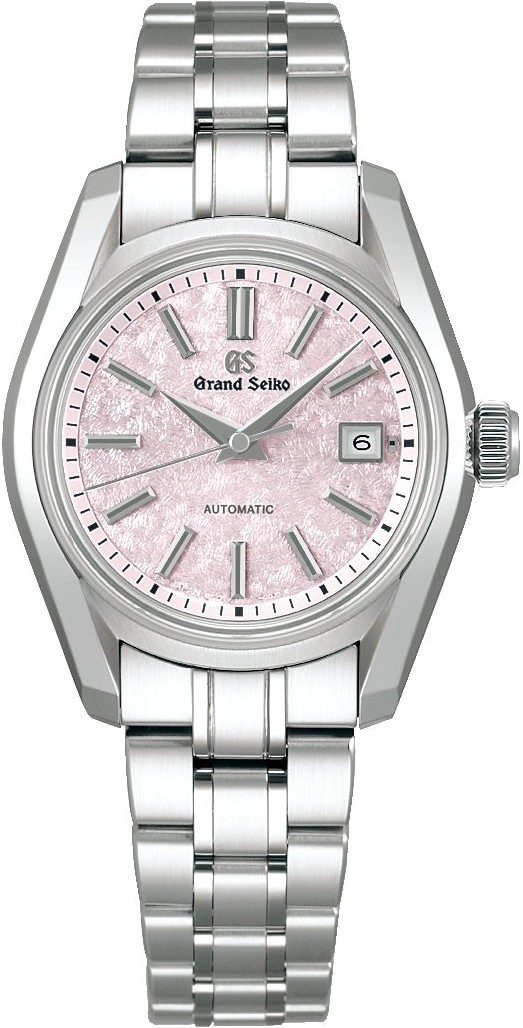 Grand Seiko Heritage 62GS Mechanical STGK031G sind luxuriöse Damen-Automatikuhr mit einem Edelstahlarmband und einer Faltschließe. Das Gehäuse aus Edelstahl mit einem Durchmesser von 36,2 Millimetern hat einen transparenten Boden. Das rosafarbene, texturierte Zifferblatt mit Datumsanzeige auf der Drei-Uhr-Position ist durch ein widerstandsfähiges Saphirglas mit Antireflexbeschichtung geschützt. Das Design des Zifferblatts ist von Kirschblüten inspiriert, die zu Beginn des Frühlings in der Region Tohoku in Japan mit Schnee bedeckt sind (sakura-kakushi). Das Uhrwerk wird von einem mechanischen 9S27 mit automatischem Aufzug und einer Gangreserve von 50 Stunden angetrieben. Dieses Uhrwerk mit Hacking-Funktion kann bei Bedarf auch manuell über die signierte Krone aufgezogen werden. Mit einer Wasserdichtigkeit von 10 ATM sind die Uhren zum Schwimmen und Schnorcheln geeignet.