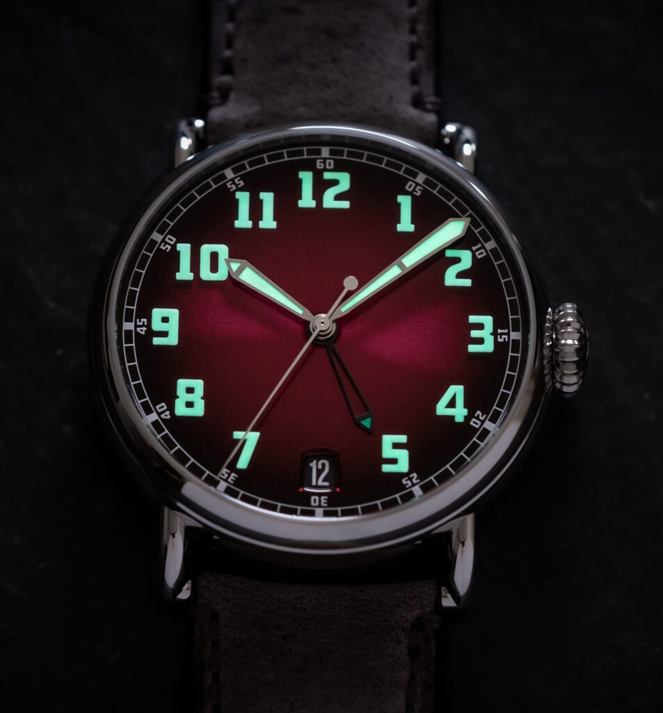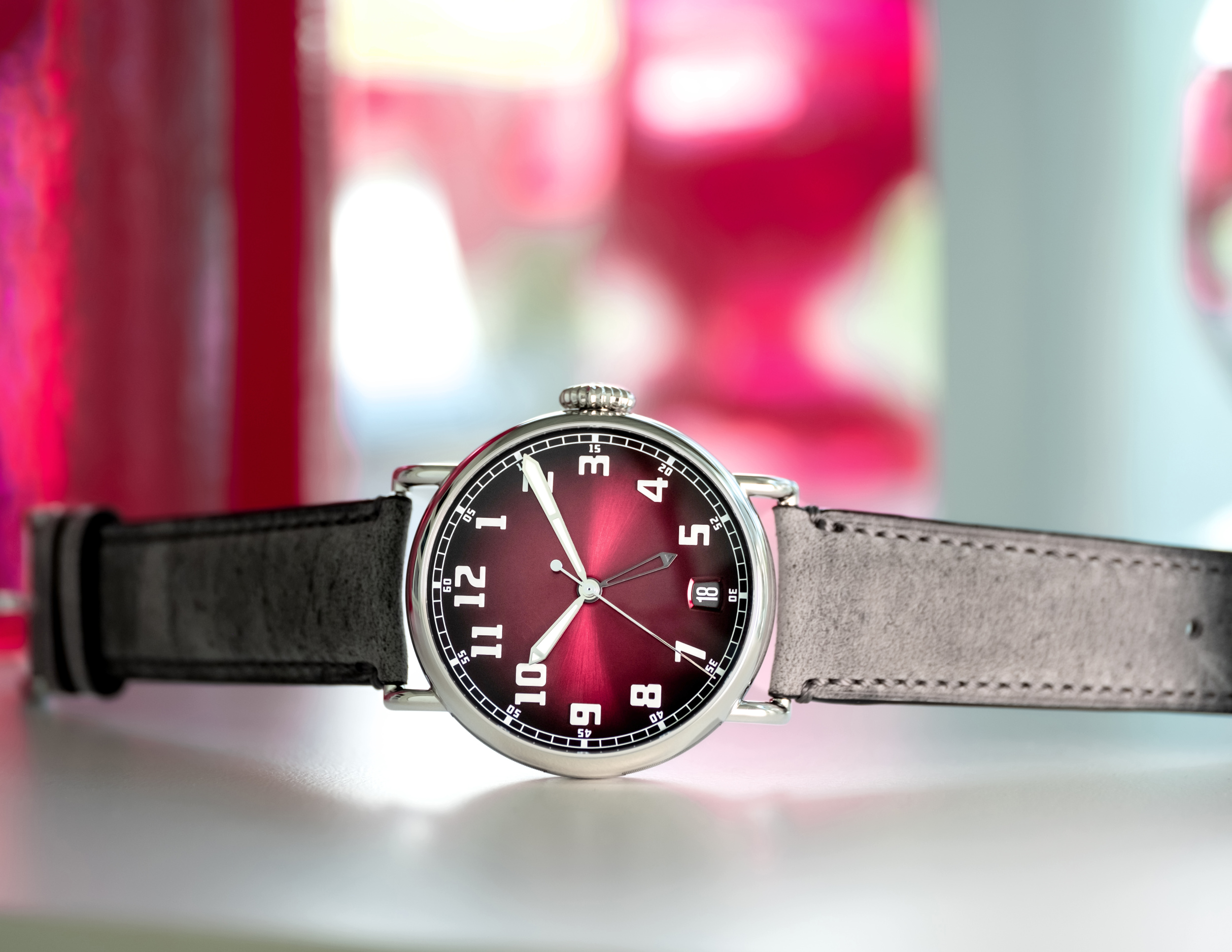 H. Moser & Cie Heritage Dual Time 8809-1200 sind luxuriöse automatische Herrenarmbanduhren mit einem grauen Lederarmband und einer Dornschließe. Das Gehäuse aus Edelstahl hat einen Durchmesser von 42 Millimetern und einen transparenten Gehäuseboden. Das weinrote Zifferblatt mit Sonnenschliff-Effekt, Datumsanzeige bei sechs Uhr und dualer Zeitzone wird durch ein widerstandsfähiges Saphirglas geschützt. Die Zeiger und Indizes sind mit einem Leuchtanstrich Globolight® versehen, der Super-LumiNova® enthält und eine perfekte Ablesbarkeit bei schlechten Lichtverhältnissen garantiert. Der Antrieb erfolgt durch ein mechanisches Kaliber HMC 809 mit automatischem Aufzug und einer Gangreserve von 72 Stunden. Mit einer Wasserdichtigkeit von 3 ATM sind die Uhren gegen Regen und beim Händewaschen geschützt.