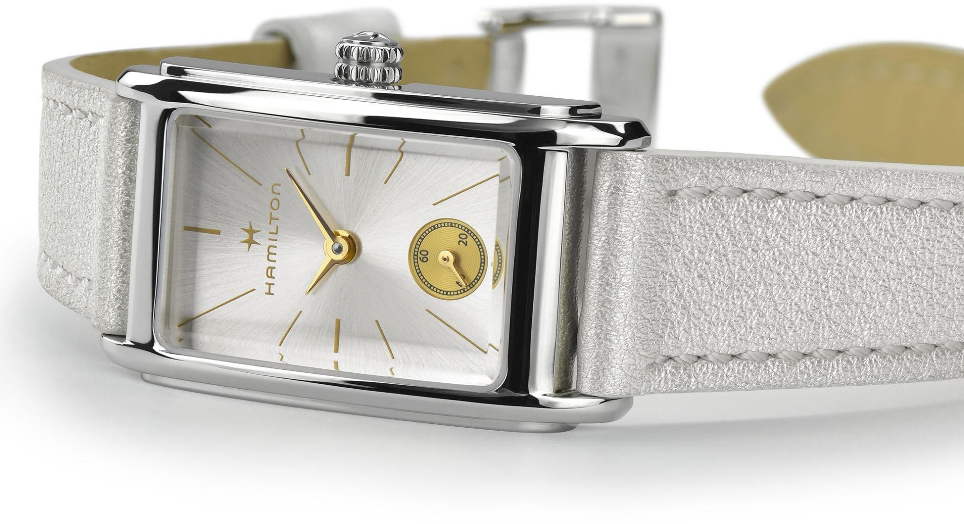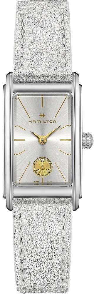 Hamilton American Classic Ardmore H11221850 sind elegante Damen-Quarzuhren mit einem silbernen Lederarmband und einer Dornschließe. Das eckige Gehäuse aus Edelstahl hat eine Größe von 19 x 27 Millimetern. Das silberne Zifferblatt mit Sonnenschliff und einer dezentralen Sekundenanzeige in Goldfarbe wird durch ein robustes Mineralglas geschützt. Das Uhrwerk wird von einem Quarz-Kaliber 980.163 angetrieben. Mit einer Wasserdichtigkeit von 3 ATM sind die Uhren regen- und spritzwassergeschützt.