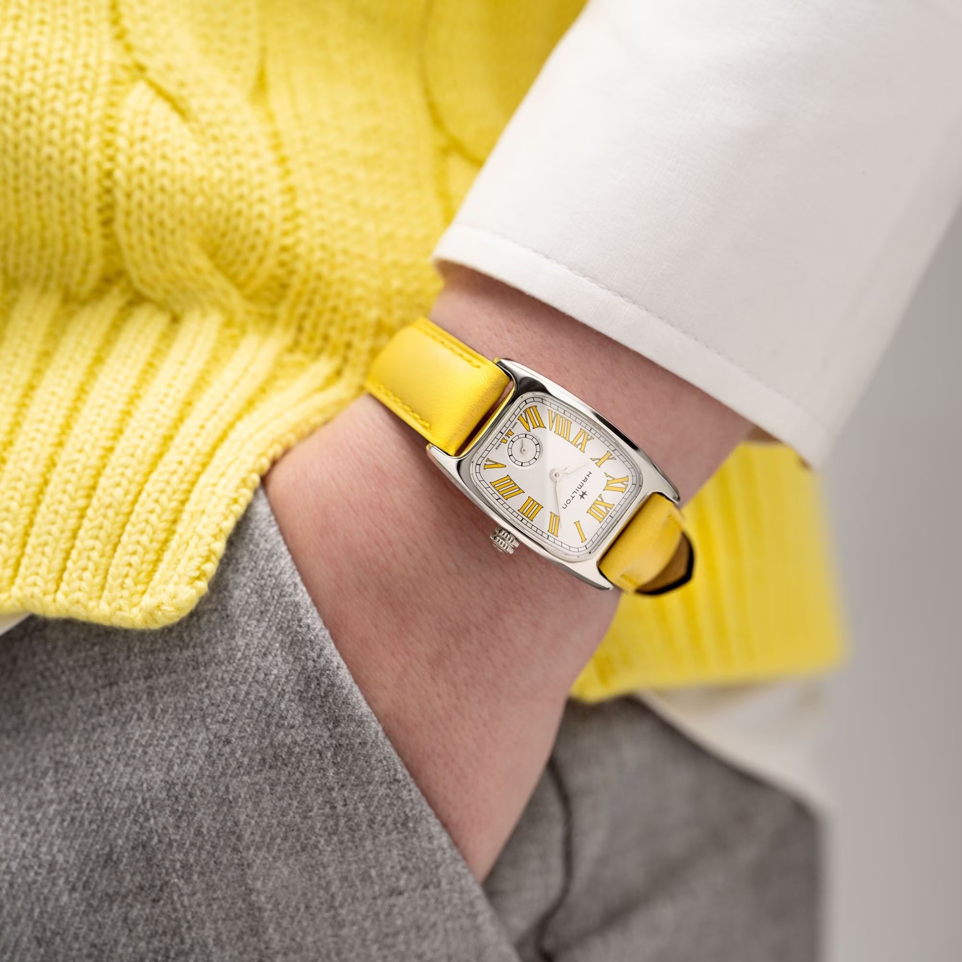 Hamilton American Classic Boulton Small Second Quartz H13321812 sind elegante Damen-Quarzuhren mit einem gelben Lederarmband und Dornschließe. Das Edelstahlgehäuse hat eine Größe von 24 x 27 Millimetern. Das übersichtliche weiße Zifferblatt mit dezentraler Sekundenanzeige wird durch ein widerstandsfähiges Saphirglas geschützt. Das Uhrwerk wird durch ein Quarzwerk 980.163 angetrieben. Mit einer Wasserdichtigkeit von 5 ATM sind die Uhren regen- und duschfest.