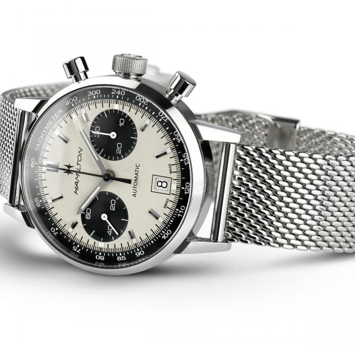 Hamilton American Classic Intra-Matic Auto Chrono H38416111 sind Herren sportliche Automatikuhren mit einem Stahl-Milanese-Armband mit Klappschließe. Es handelt sich um eine moderne Version des ikonischen Chronographen der Marke aus dem Jahr 1968. Das Gehäuse aus Edelstahl hat einen Durchmesser von 40 Millimetern und eine verschraubte Krone. Das weiße Zifferblatt  mit Datumsanzeige, zwei schwarzen Subzifferblättern der Stoppuhr (sogenanntes Panda-Zifferblatt) und einer inneren Lünette mit Tachymeterskala wird durch ein widerstandsfähiges Saphirglas mit Antireflexbeschichtung geschützt. Die Zeiger und Indizes verfügen über einen lumineszierenden Anstrich Super-LumiNova®, der perfekte Ablesbarkeit bei schlechten Lichtverhältnissen garantiert. Der Antrieb der Uhr wird durch ein mechanisches Kaliber H-31 mit automatischem Aufzug und einer Gangreserve von 60 Stunden gewährleistet. Mit einer Wasserdichtigkeit von 10 ATM sind die Uhren für Schwimmen und Schnorcheln geeignet.
