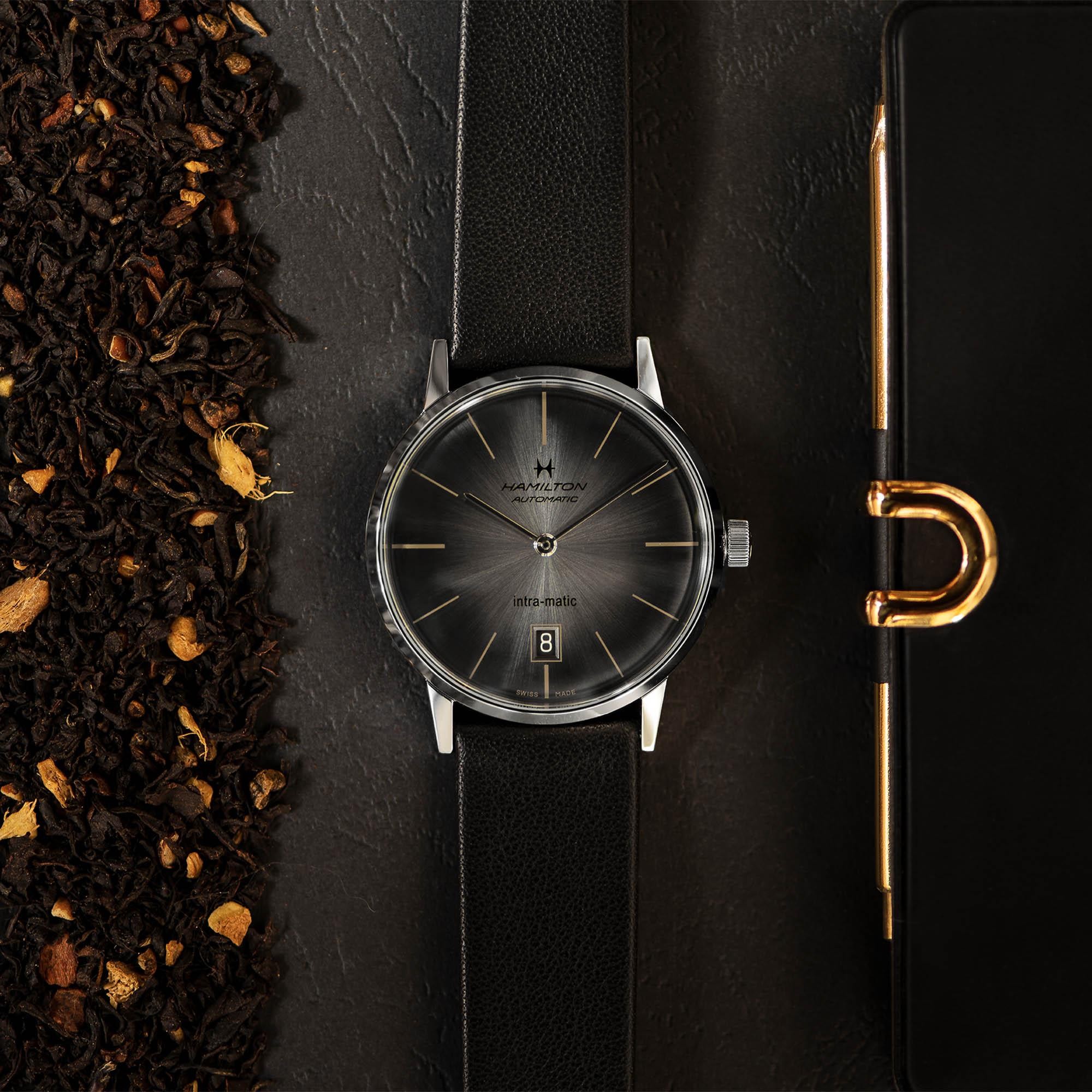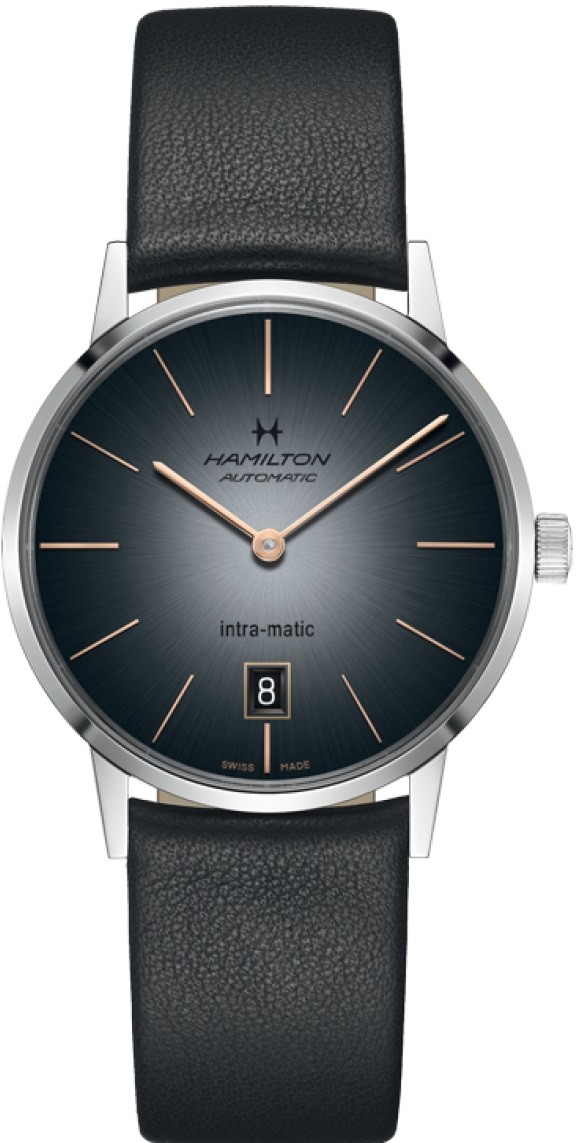 Hamilton American Classic Intra-Matic Auto H38455781 sind elegante Herren-Automatikuhr mit einem schwarzen Lederarmband mit Dornschließe. Das Edelstahlgehäuse hat einen Durchmesser von 38 Millimetern und einen transparenten Gehäuseboden. Das anthrazitfarbene Zifferblatt mit Farbverlauf und Datumsanzeige auf sechs Uhr wird durch ein robustes saphirbeschichtetes Glas geschützt. Der Antrieb der Uhr erfolgt durch ein mechanisches ETA 2892-A2 Uhrwerk mit automatischem Aufzug und einer Gangreserve von 42 Stunden. Mit einer Wasserdichtigkeit von 5 ATM ist die Uhr regen- und duschbeständig.